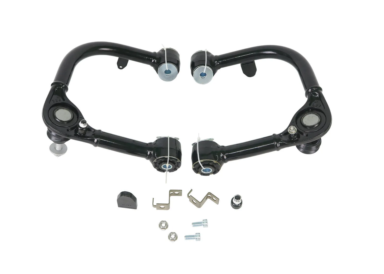 A short fall of the modern day IFS 4wd is the adjustment range provided for successful wheel alignments, this becomes even more of an issue when the vehicle is lifted by more than 1 inch. Not only does the vehicle run into camber and caster issues, but ball joint articulation and clearance issues to the coil over strut at ride and droop height. The new Whiteline offset UCA (Upper Control Arm) is an all-in-one solution for any vehicle that has been lifted between 30mm and 70mm. Providing an increase between +2.0 degrees of caster and up to 1.5 degrees of negative camber increase (figures quoted are based off an approximate 50mm/ 2 inch) along with greater clearance to the coil over strut and more articulation of the arm by virtue of new maintenance free GIIRO bushing technology.