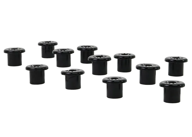 A critical service item for any leaf sprung vehicle. High kilometres and heavy load carrying causes excessive wear on rubber bushings. Whiteline's signature black bushings are made tough and offer outstanding abrasion resistance, high load bearing capability (4WD's, utes and towing), flexibility, increased tensile strength and chemical resistance to oil, grease, ozone and weathering.