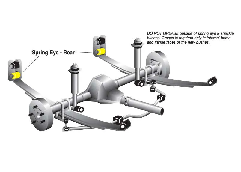 A critical service item for any leaf sprung vehicle. High kilometres and heavy load carrying causes excessive wear on rubber bushings. Whiteline's signature black bushings are made tough and offer outstanding abrasion resistance, high load bearing capability (4WD's, utes and towing), flexibility, increased tensile strength and chemical resistance to oil, grease, ozone and weathering.
