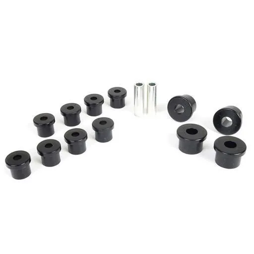 All in one leaf spring bushing service kit covering front and rear eyes of the leaf plus shackle bushings. High kilometres and heavy load carrying causes excessive wear on rubber bushings. Whiteline's signature black bushings are made tough and offer outstanding abrasion resistance, high load bearing capability (4WD's, utes and towing), flexibility, increased tensile strength and chemical resistance to oil, grease, ozone and weathering.