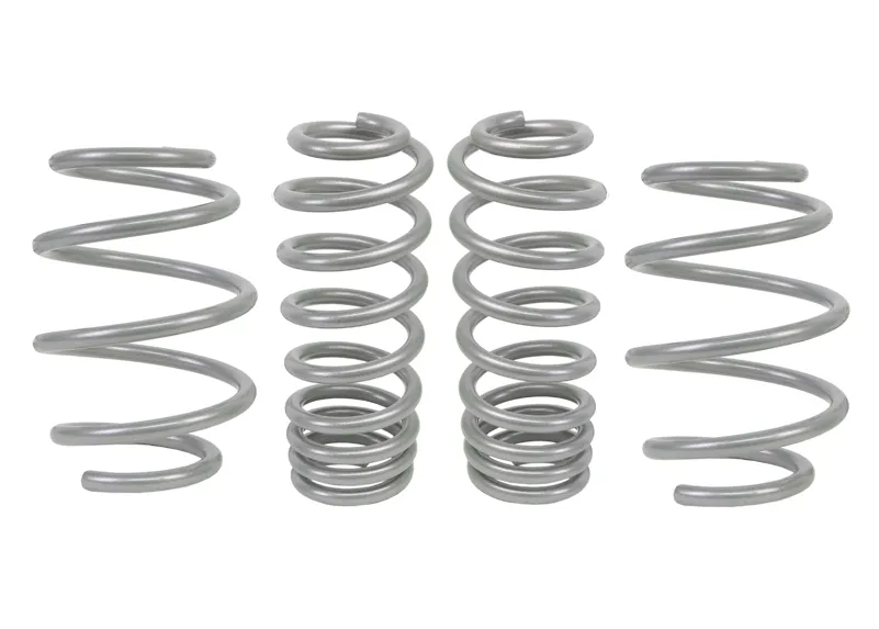 Whiteline Springs deliver improved vehicle performance whilst maintaining safety and ride quality characteristics. This kit contains 3.6kg/mm (201lb/in) front rated springs that provide a 25mm drop while the 4.0kg/mm (225lb/in) rated rears deliver a desirable 25mm to the vehicle. By lowering the vehicles centre of gravity, the unique and progressive rate coil design not only improve performance but enhance overall appearance. Developed and manufactured in Europe from the highest quality materials, coating and to the finest tolerances guaranteeing exact fitment. Whiteline Springs are engineered for optimal balance with OEM and aftermarket shocks. For total grip activation match with Whiteline Sway Bar and Essentials kit for unrivalled handling and optimal vehicle performance.