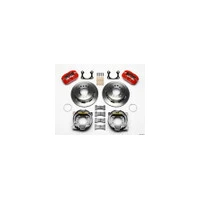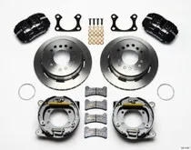 Forged Dynapro Low-Profile Pro-Series rear disc brake kits provide a complete solution for popular muscle car rear axles on applications that require a parking brake assembly and extra clearance for 14.00" to 15.00" rim applications. Forged billet Dynapro Low-Profile four-piston calipers 11.00" one-piece hat and rotor assemblies, and high friction pads provide optimized and balanced braking for all types of custom performance street/strip and show machines. The neatly hidden internal shoe system provides a clean installation with superior static holding power for parking. Optional caliper finishes and rotor designs enable the builder to personalize the style and optimize brake performance for every individual application.