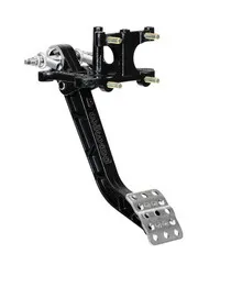 This swinging mount pedal assembly mounts two single outlet brake master cylinders in a reverse position inside the firewall. It features a lightweight aluminum frame, with a high strength reinforced I-Beam style forged 5.1:1 ratio pedal arm. The non-skid waffled pedal pad can be laterally adjusted for driver preference or clearance as necessary. The balance bar incorporates a positive detent stop every full turn to maintain adjustment position and driver awareness. A pin and clevis pushrod attachment system provides highest possible degree of misalignment angle for bind free operation through the entire range of travel. The balance bar can be locked in place with the included jam nut, or used with an optional remote cable for quick on-track adjustments. This pedal accepts any Wilwood vertical mount flange single outlet master cylinders that are ordered separately by style and bore size.