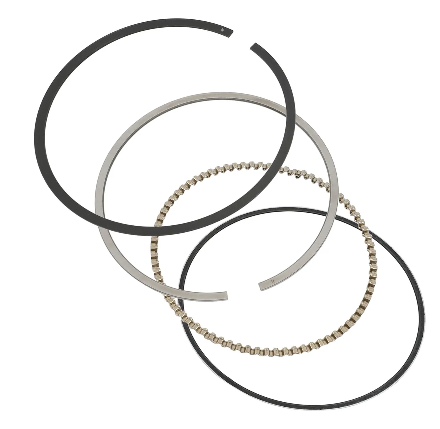 1.2mm steel, positive twist, gas nitride top; 1.2mm taper underhook, ductile iron second ring; 3mm oil ring Hastings Cross over SN9045005