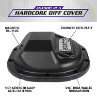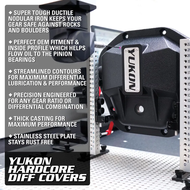 Yukon Hardcore Diff Covers are constructed from thick-walled, high-strength nodular steel to protect lockers, gears and axles from the most extreme hits in off road driving. They also increase the structural rigidity of the differential, reducing deflection under high-torque situations that can put severe loads on vital internal parts. Yukon Hardcore Diff Covers feature a durable powder coat finish and high strength steel fasteners for easy bolt-on installation. Its no secret that the underside of your rig can take a beating. Remember your diff! Its the lowest hanging fruit and very susceptible to damage crack or break it and youre done for the day. Upgrade to a Yukon Hardcore Diff Cover and enjoy more peace of mind on the trail.