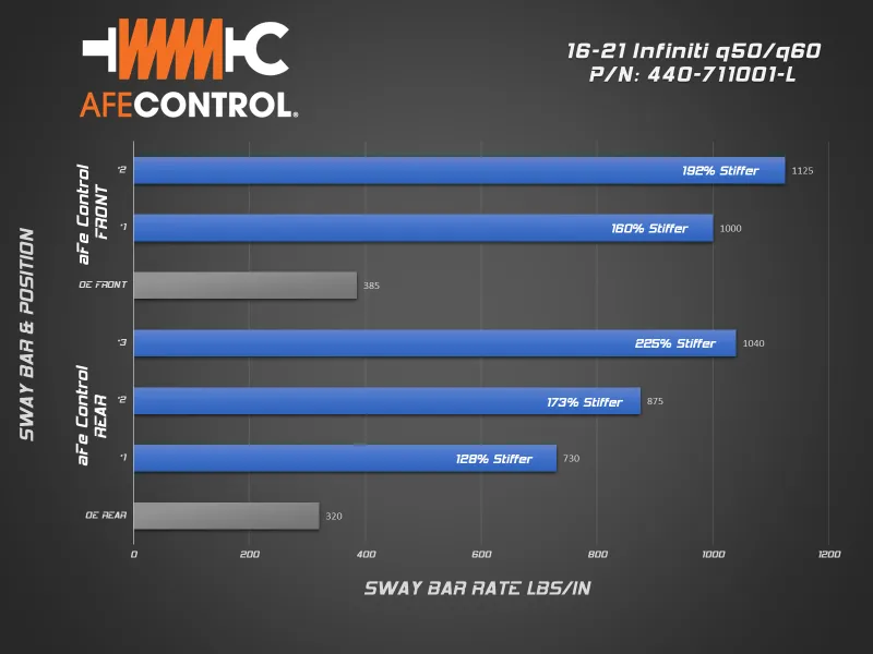 Whether its stability on the track, more rotation on the autocross, or just adding confidence in the canyon, aFe CONTROL sway bars will deliver. Every aFe Control sway bar is CAD designed and CNC bent to strict tolerances. This insures precise fit and perfect operation. Our front sway bar has 2-way adjustment and the rear has 3-way adjustment. This allows the driver to dial in the front and rear roll resistance to achieve the desired handling bias. Both front & rear sway bars utilize CNC machined ends. These are TIG welded to the bar in a dedicated fixture to insure accurate hole positioning and consistent manufacturing. aFe Control includes low-deflection polyurethane bushings and premium 6061-T6 aluminum black anodized billet brackets. Brackets are equipped with grease fittings for easy maintenance.