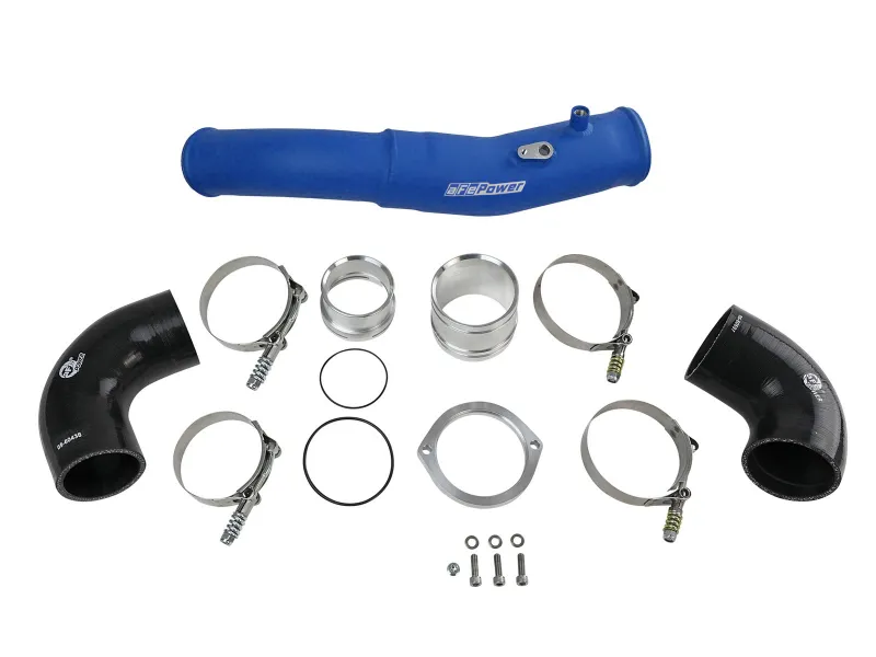 Smooth transitions in the mandrel-bent aluminum tubing decrease turbulence and minimize pressure loss, increasing horsepower and torque. This tube kit includes high-quality, stainless-steel, spring-loaded T-bolt clamps and heavy-duty, 5-ply, polyester reinforced silicone couplings. This intercooler tube kit features a factory style billet aluminum quick-connect adapter with an O-ring seal to ensure a leak-free fit while maintaining superior strength and durability. Finished in Matte Blue powder coating with a unique laser-etched aFe power logo for a custom look.
