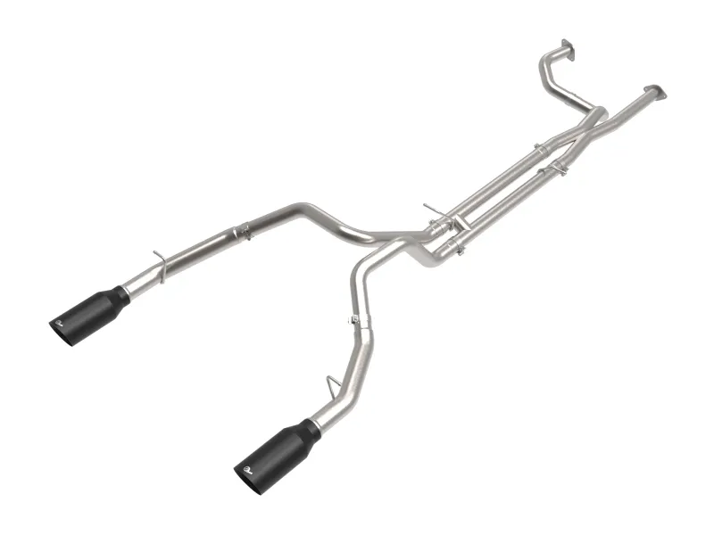 The Vulcans unique X / H-pipe design improves the RAM TRX exhaust flow direction and utilizes no mufflers delivering more power and an aggressive tone throughout the RPM range without interfering with driver or passengers hearing in the cab. Both mitered merge x-pipe and crossover balance tube replaces mufflers to evenly distribute exhaust pulses which maximizes scavenging, reduces drone and improves sound. On the throttle, this system produces an aggressive, deep exterior sound releasing horsepower and torque. At cruising RPMs the Vulcan maintains sound quality in the cab. MIG-welded, 3 IN mandrel-bent 304 stainless steel tubing increases to 3-1/2 diameter tailpipes for a Large Bore style exhaust. Dual 6 IN large diameter, 304 stainless steel exhaust tips with matte black finish features laser-etched aFe POWER logos for a unique style. Utilizing factory style flanges and hangers this system is a direct bolt-on system, which requires no cutting or modifications for a hassle-free installation.