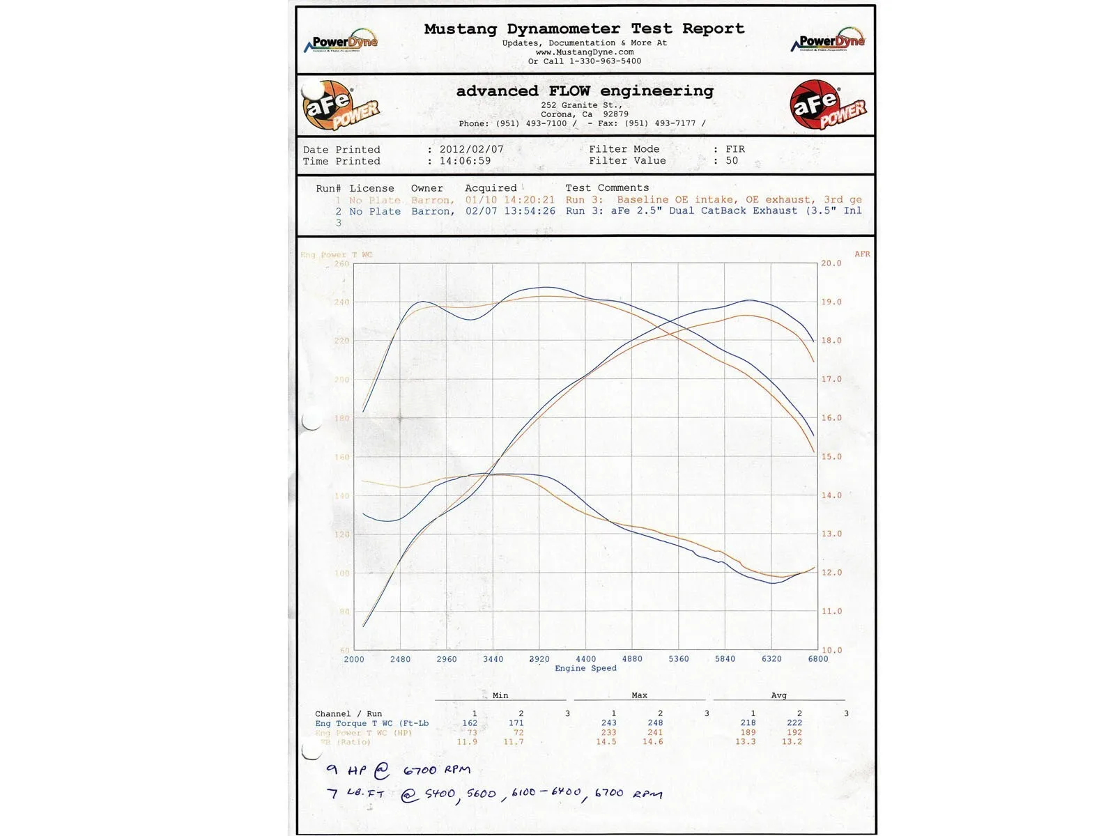 • In house testing produced a max gain of +9 horsepower and +7 ft. lbs. of torque verified by our in house dyno