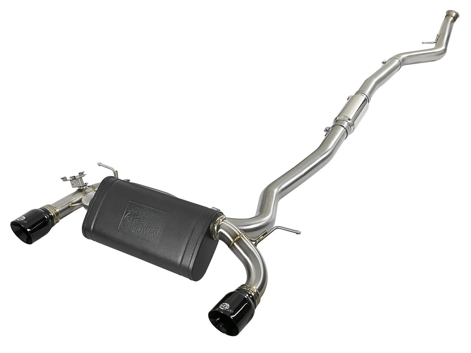 The aFe MACH Force-Xp cat-back exhaust system for the BMW N55 exceeds your quality and performance expectations. 3"- 2-1/2" mandrel bent 304 stainless steel tubing and high flow transverse muffler offers maximum exhaust flow and incorporates a factory style exhaust valve to control the exhaust note. The valve utilizes the factory valve motor and factory performance modes. When closed, it directs the exhaust through the high flow muffler for a smooth, tuned exhaust note. When opened, the exhaust is allowed to bypass the muffler and unleash the sound and performance of your N55. Large 4" diameter gloss black stainless steel exhaust tips come with a laser-etched aFe POWER logo for a stylish finish.