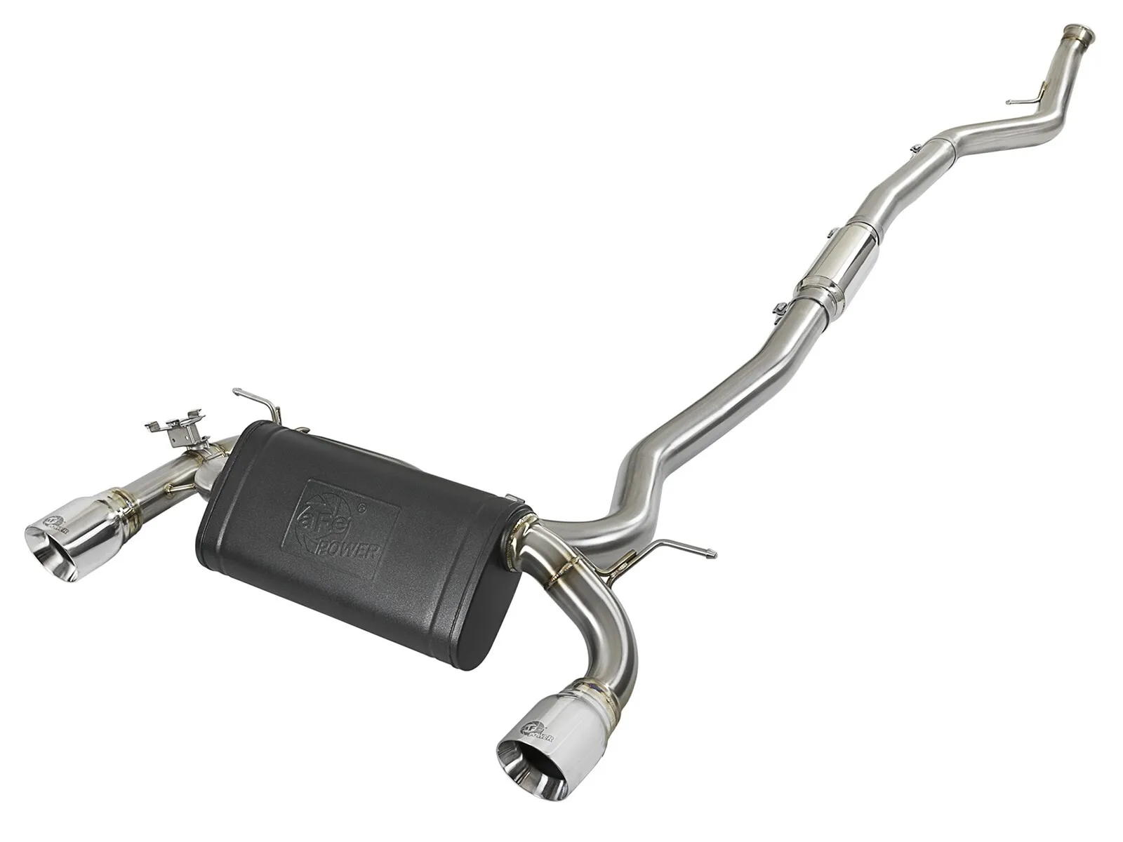 The aFe MACH Force-Xp cat-back exhaust system for the BMW N55 delivers uncompromising quality and performance. 3"- 2-1/2" mandrel bent 304 stainless steel tubing and high flow transverse muffler offers optimum exhaust flow and incorporates a factory style exhaust valve to control the exhaust note at all throttle inputs. The system utilizes the factory valve motor and factory performance modes. Closed, it directs the exhaust through the high flow muffler for a smooth, tuned exhaust note. When opened, the exhaust bypasses the muffler to unleash the full performance potential and aggressive note from your N55. Large 4" diameter polished stainless steel exhaust tips come with a laser-etched aFe POWER logo for a stylish finish.