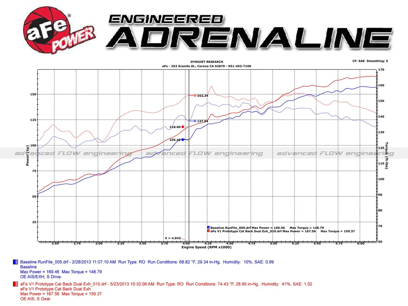 Dyno-Proven Performance Gains: In testing, the cat-back exhaust system resulted in gains up to +13 horsepower and +16 lbs. x ft. of torque, as measured on our in-house dyno.