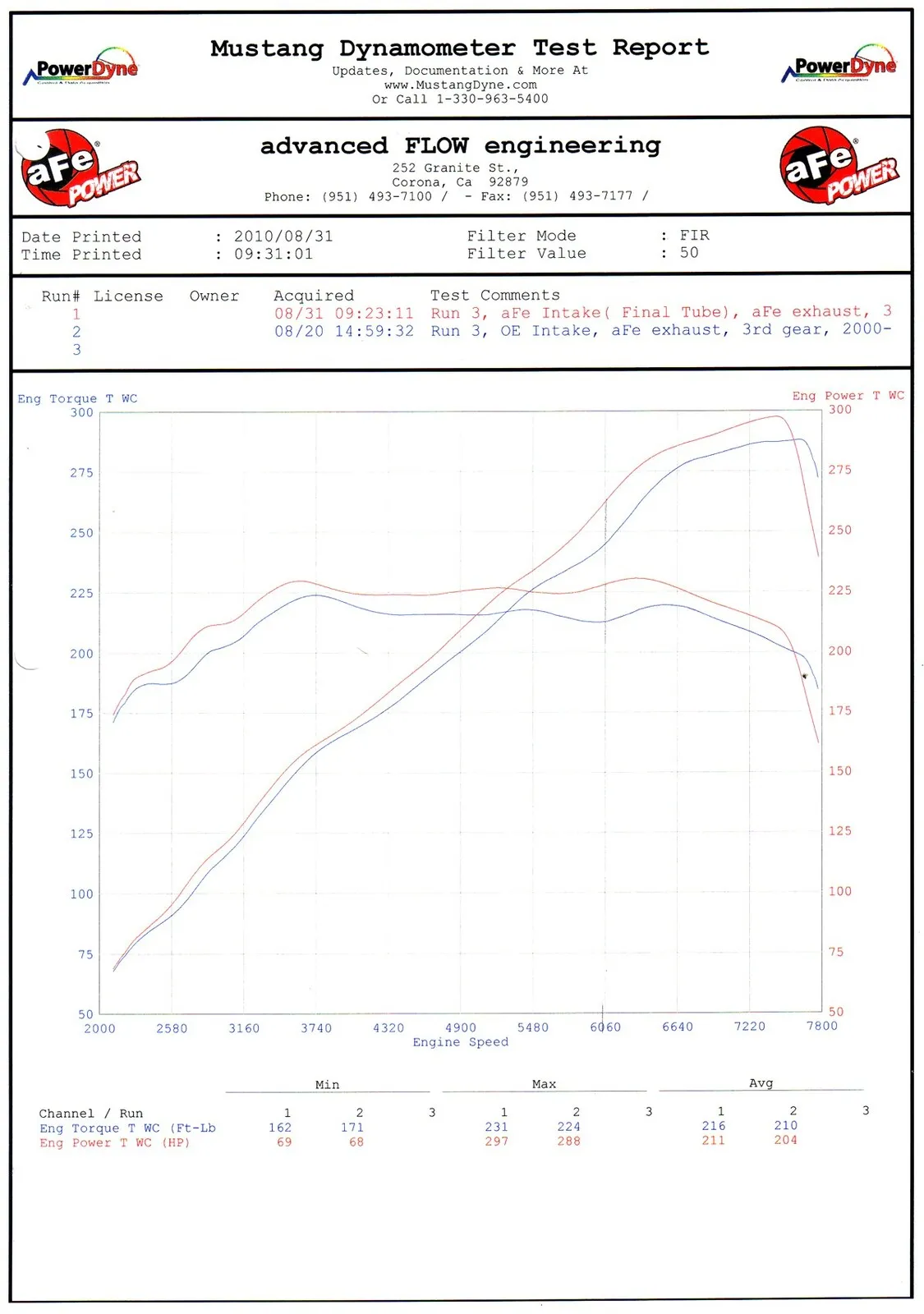 This Stage-2 air intake system produces 12 max horsepower, 9 lbs. x ft. torque and out-flowed the factory intake by 41%. This unique intake system is designed to use the factory intake box to seal the intake tube and filter and tube against unwanted underhood temperatures while increasing air flow and velocity for optimum performance. This air intake system features a washable/reusable conical Pro 5R air filter for maximum flow and filter life, a dyno tuned intake tube and all the hardware necessary for an easy installation. This system is truly a silent killer.
