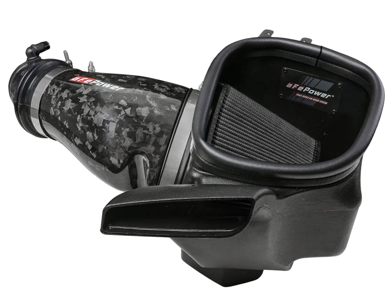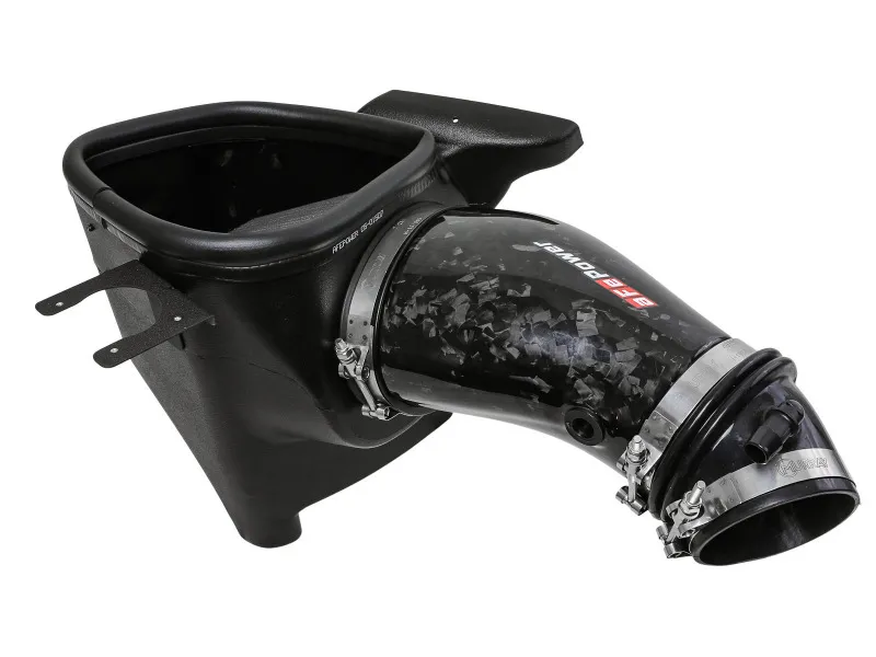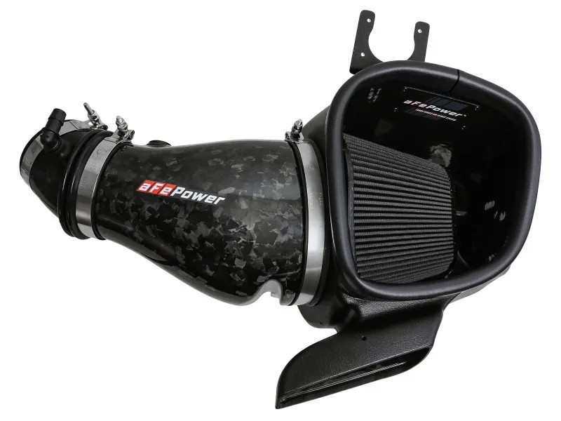 This 7 tall 360-degree radial flow air filter features a 5-1/2" by 7-1/2" flange and our pre-oiled black Pro 5R media with five layers of progressively finer cotton gauze media for maximum performance. It provides your engine with the largest amount of high-flowing air and delivers the highest power gains in most cases, while adding a stealthy look in the engine bay. This media is perfect for street and/or track use. The included massive air filter is surrounded by an open-element XLPE (cross-linked polyethylene) polymer housing that minimizes warm engine air for maximum performance. Its open design allows for easy viewing of the air filter and delivers an aggressive Air Intake sound. Multiple air inlets bring in cool air when under power without capturing any warm air surrounding the engine. The factory MUA (Multi-Air Unit Actuator) is easily transferred to the aFe POWER housing to guarantee correct crankcase flow, avoiding check engine lights and damaging factory hoses and sensors. The lightweight tube is computer-designed to achieve maximum power gains while maintaining a perfect fit. Manufactured from 100% forged carbon fiber, it features zero fiberglass and is clear-coated for the highest quality construction, inspired from the optional forged carbon fiber interior accents. This is a direct fit intake system that utilizes factory mounting points. All necessary stainless-steel clamps, silicone coupling, and hardware are included. Its revolutionary design, featuring our patent pending filter-to-housing interface, uses half the number of parts of a traditional cold air intake system.