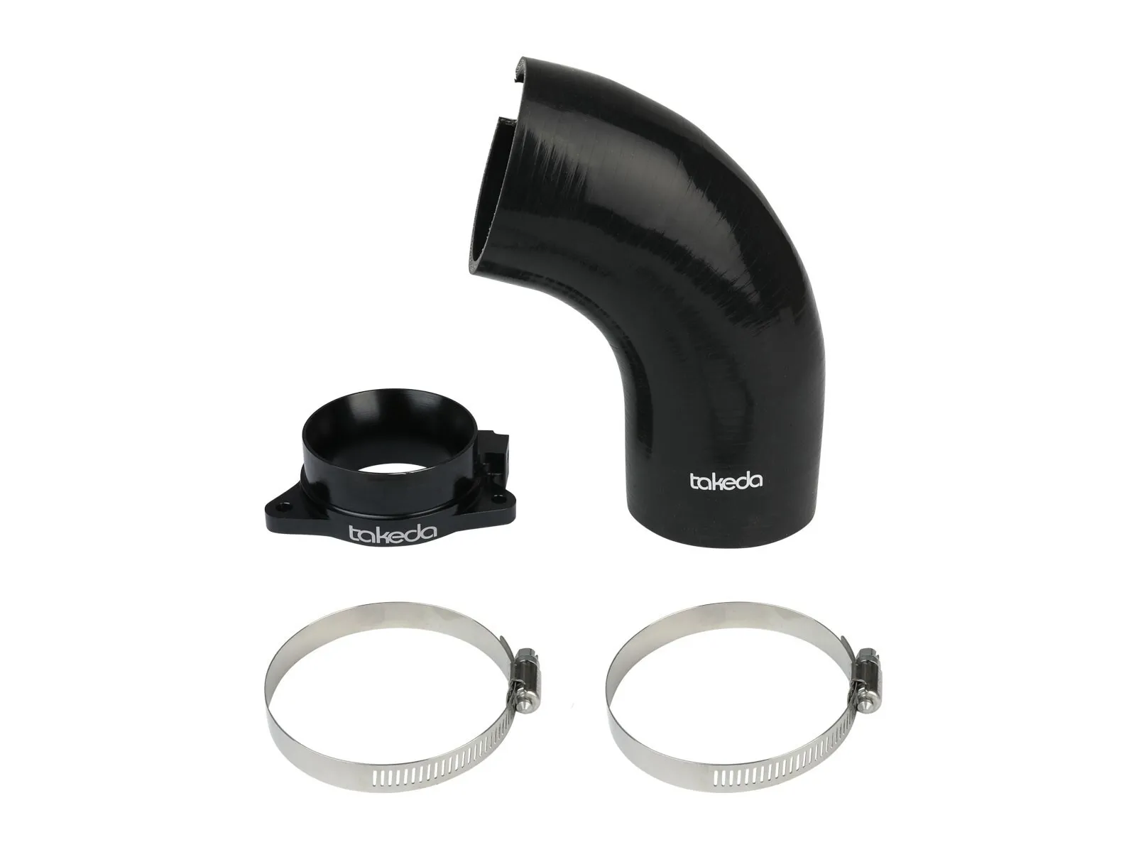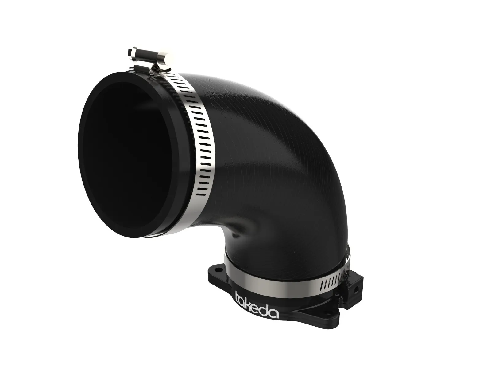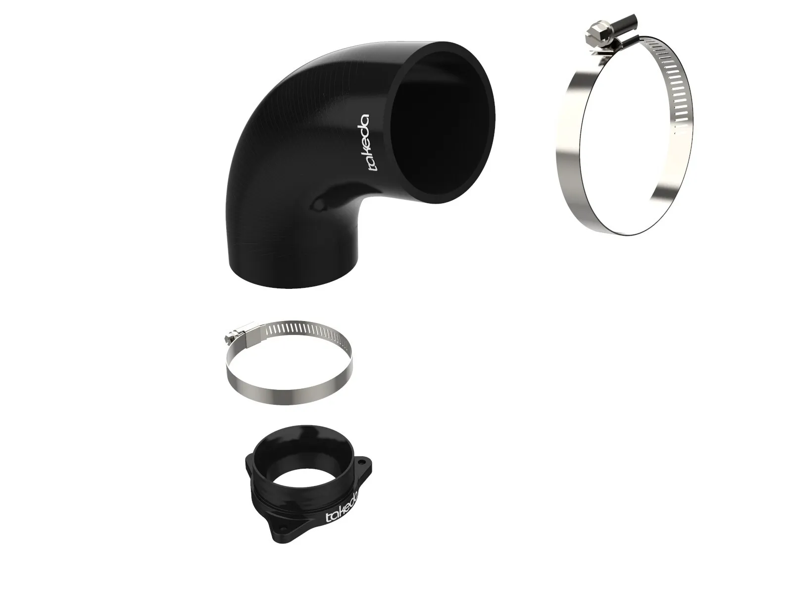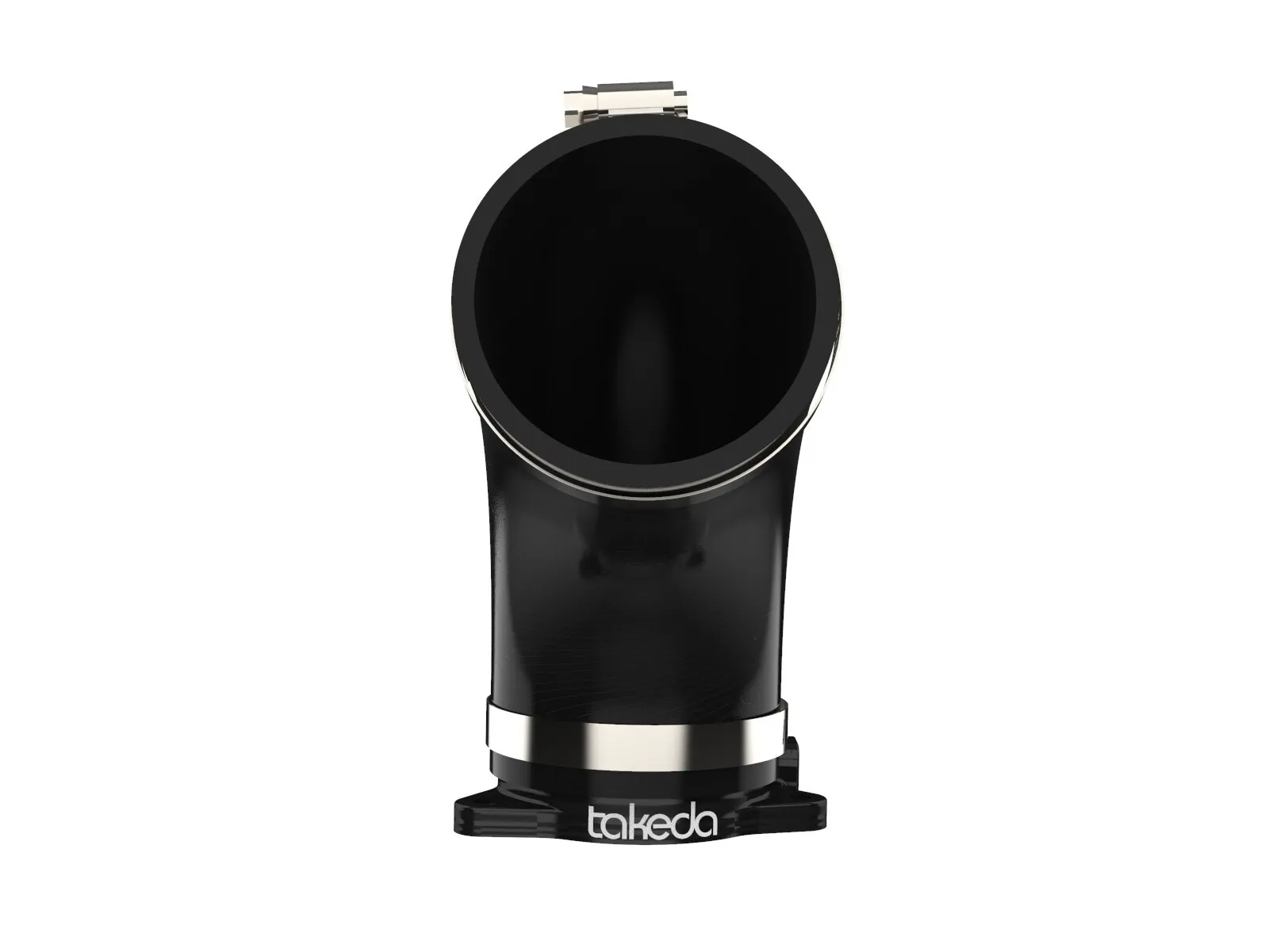 Aluminum CNC machined adapter: Precisely CNC machined out of 6061-T6 billet aluminum, the adapter mounts directly onto the turbo and guides the increased air flow from the Takeda intake into the turbo. It is black anodized for durability and a stealthy appearance.