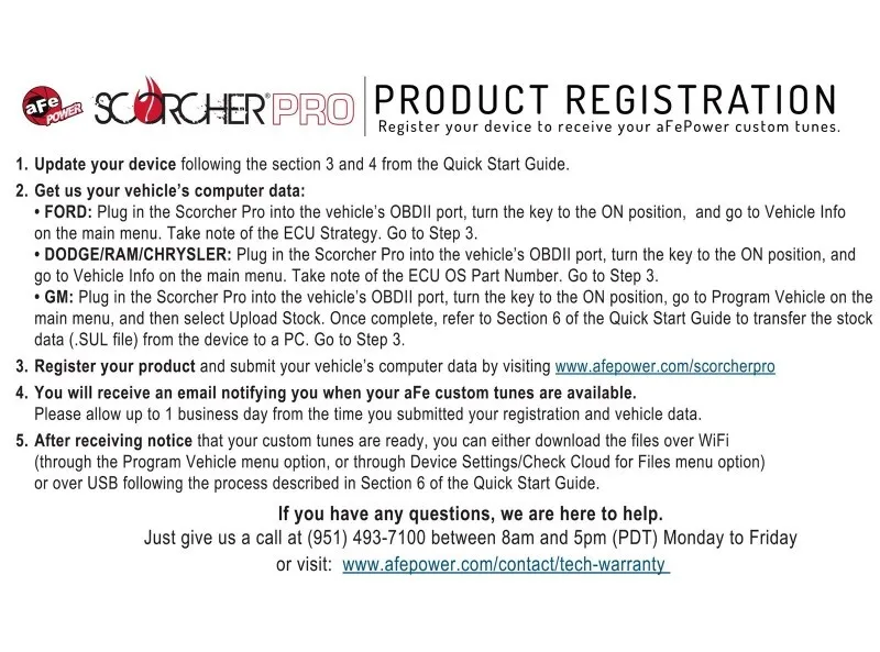 The customer will need to register online (https://afepower.com/scorcherpro/register) and enter their vehicle information to receive his custom tunes. The customer will also have the ability to adjust vehicle parameters such as tire size, axle ratio, and TPMS. The device also stores your vehicles factory tune for easy restoration back to the factory settings. Connects to the vehicles OBDII port and has Wi-Fi capability so you can download aFe POWERs custom tunes whenever or wherever you want. Custom tunes can also be downloaded through a PC if desired. Monitor and display critical vehicle data using on-screen, full color customizable gauges. View, capture or download your vehicles data on one device. The SCORCHER PRO Performance Programmer offers the capability to read and clear DTCs (diagnostic trouble codes). SCORCHER PRO Bypass Cable is required (P/N: 77-90009 Sold Separately)