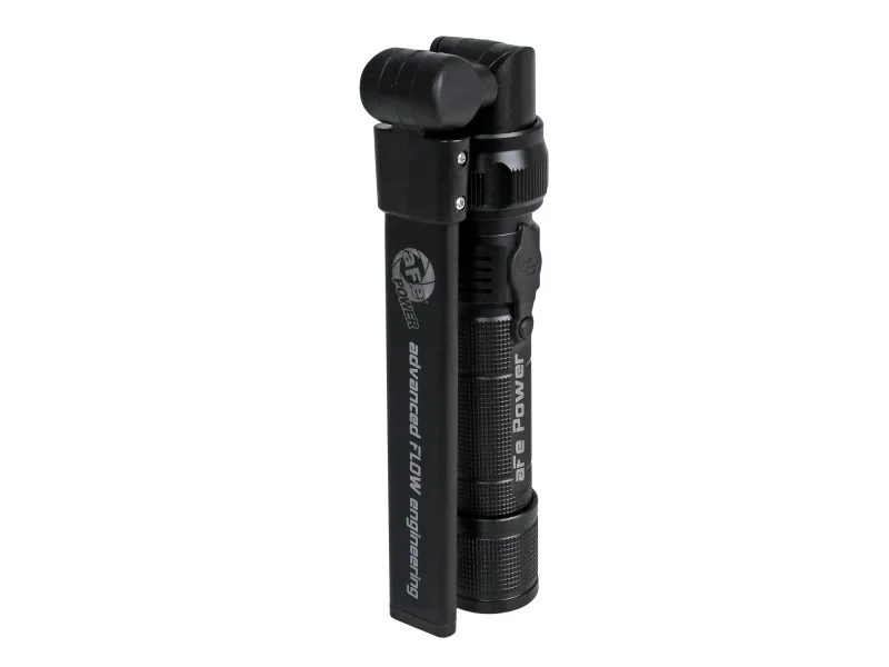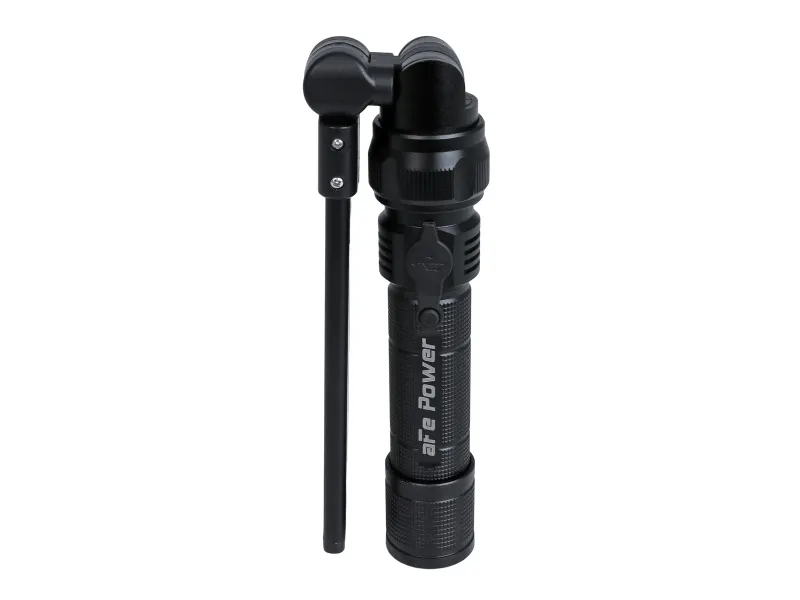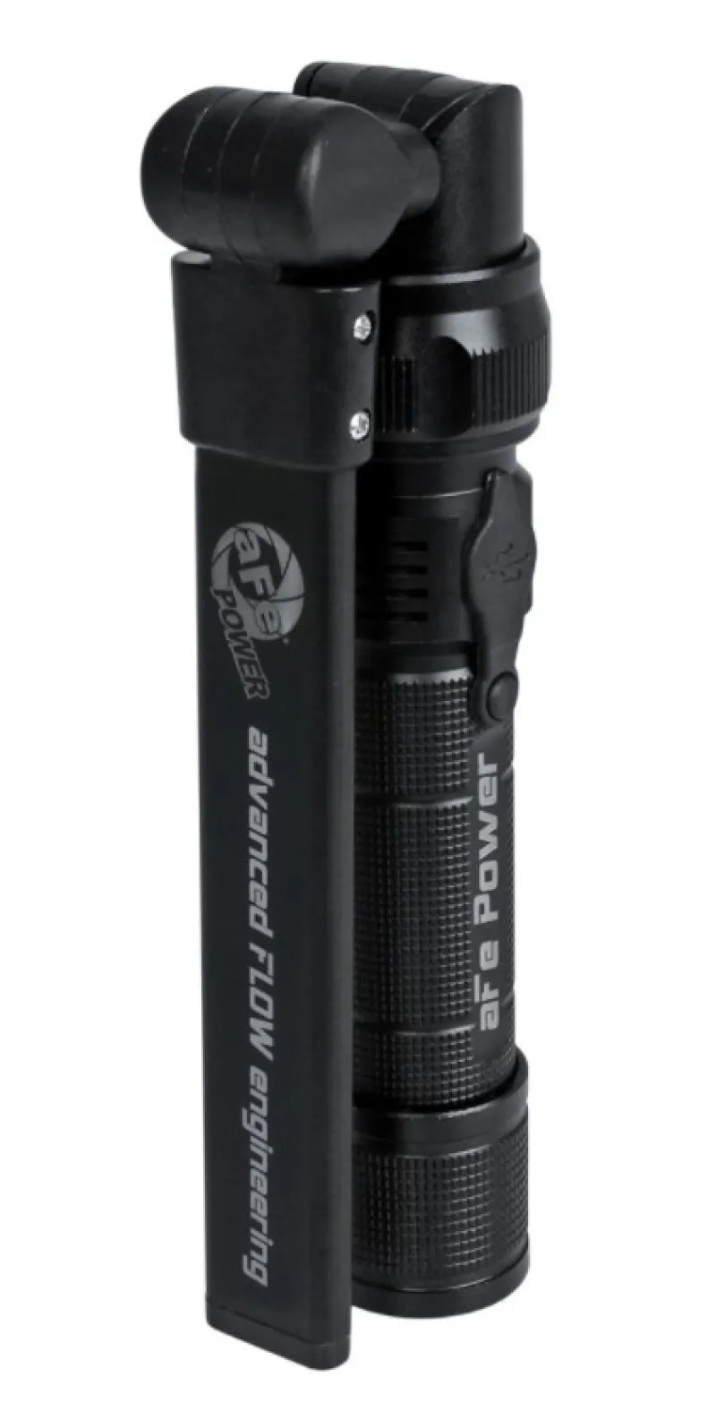 Introducing the new aFe POWER 360-degree folding LED work light. This LED light features a strong magnetic base that allows you to put it on any metal surface. You can mount this light almost anywhere you need too. Whether your working on your car, in your garage or around the house, this 350 Lumen LED light provides you with a wide area illuminating light, which you can adjust to any position with its unique 360-degree rotation. For the times you need a small light to get into those tight spots, this light also features a small 50 lumens Samsung LED at the head of the tip. This allows you to reach into those small tight spaces to illuminate those dark hard to reach areas. Whether youre working in the garage or need some light on the road, this work light is the perfect companion. LED has a low power draw, giving this USB rechargeable light long running time, and will charge from your vehicles USB port. It easily fits in the palm of your hand and nicely folds in half. This small compact design fits into any glove box, center console or storage box.