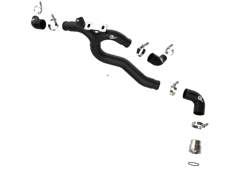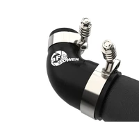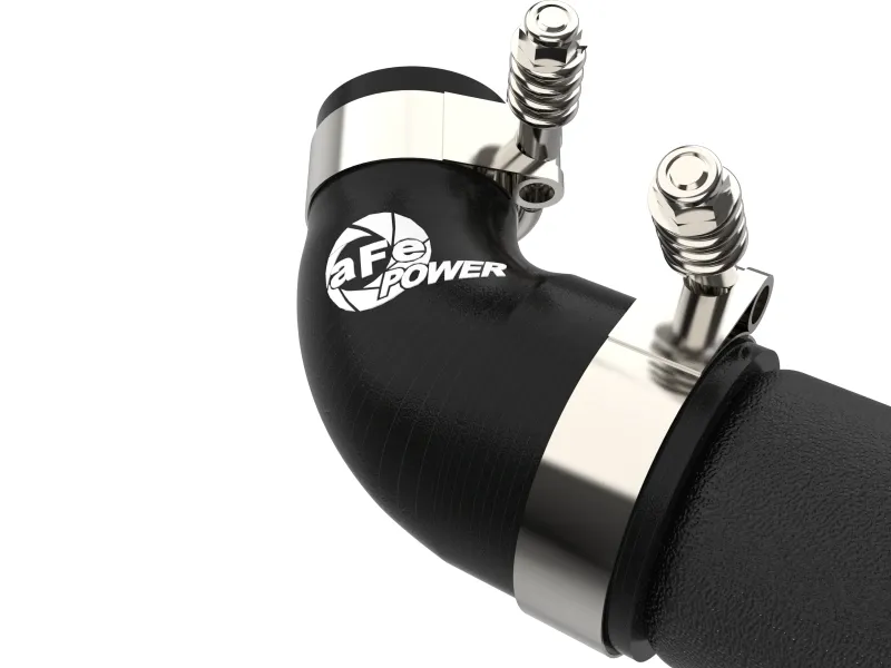 Smooth transitions in the mandrel-bent aluminum pipes decrease turbulence and minimize pressure loss, increasing horsepower and torque. This kit includes high-quality, stainless-steel, spring-loaded T-bolt clamps and heavy-duty, 5-ply, polyester reinforced silicone couplings. This charge pipe kit features factory style billet aluminum quick-connect adapter with an o-ring to ensure a leak-free fit while maintaining superior strength and durability. Finished in wrinkle black powder coating with a unique laser-etched aFe power logo for a custom look.