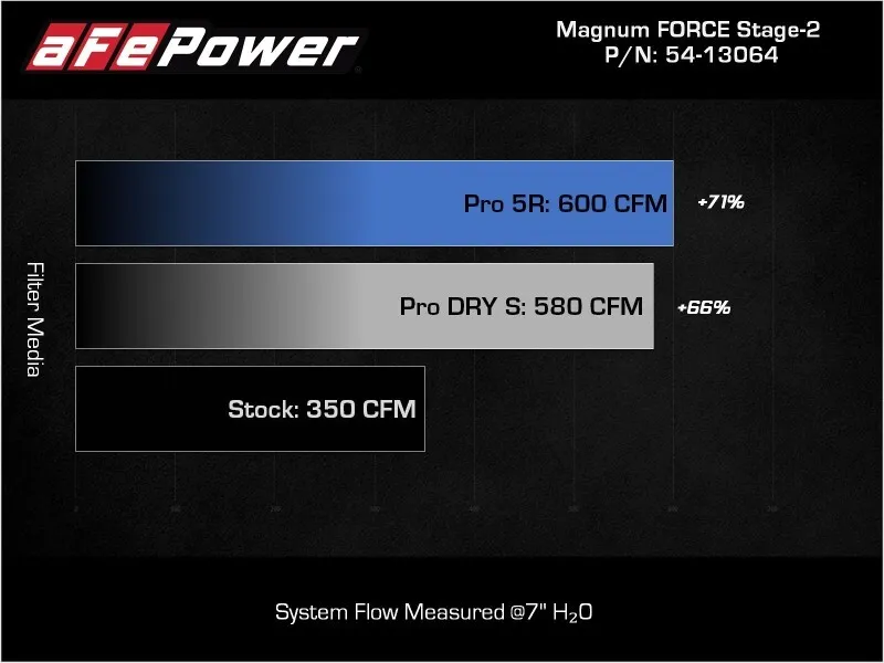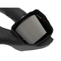 This 9 tall 360-degree radial flow air filter features a 5-1/2" flange and our oil-free Pro DRY S media with three layers of synthetic media for maximum convenience. Its progressive layering provides great filtration efficiency and dust holding capacity, while not requiring the use of oils. This media is best suited for street use. Its inverted top makes for more filter surface area, resulting in longer service intervals. The included massive air filter is surrounded by an open-element XLPE (cross-linked polyethylene) polymer housing that minimizes warm engine air for maximum performance. Its open design allows for easy viewing of the air filter and delivers an aggressive Air Intake sound. It utilizes the vehicle's OE air inlet with no additional hardware. The built-in air intake scoop captures cold air directly from the top of the radiator support thanks to its huge opening. This system features a high quality, computer-designed, dyno-tuned intake tube to achieve maximum power gains while maintaining a perfect fit. Its XLPE material is heat soak resistant and extremely durable. The computer designed system utilizes factory mounting locations, minimizing the use of unnecessary hardware, and ensuring a perfect fit every time. Its innovative design makes for a hassle-free, direct bolt-on installation process that requires no cutting or drilling. Stainless-steel clamps are included for strength, and a premium silicone coupling allows for ample flexibility. Magnum Force intakes are designed with fewer parts for a fast and easy installation.
