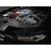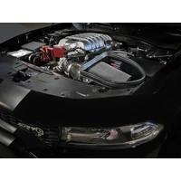 This 10 tall 360-degree radial flow air filter features our oil-free Pro DRY S media with three layers of synthetic media for maximum convenience. Its progressive layering provides great filtration efficiency and dust holding capacity, while not requiring the use of oils. This media is best suited for street use.. This Track Series air filter was specially designed for the Redeye and features a carbon fiber top. A 100% high gloss twill weave carbon fiber intake tube is used achieve maximum power gains while maintaining a perfect fit and reducing weight. The included massive air filter is surrounded by an open-element XLPE (cross-linked polyethylene) polymer housing that minimizes warm engine air for maximum performance. Its open design allows for easy viewing of the massive air filter, yet seals to the hood to gather air from the factory hood scoop. The housing also connects to the factory front grille air inlet thanks to the scoop inlet provided. This is a direct fit intake system that utilizes factory mounting points. All necessary T-bolt clamps, a silicone bellows coupling, and all other hardware is included. For the SRT Hellcat Redeye, the factory MUA (Multi-Air Unit Actuator) is easily connected to the air intake tube. All clamps and hose are provided to guarantee correct crankcase flow, avoiding check engine lights and damaging factory hoses and sensors. The removal of the factory scoop and installation of the aFe POWER scoop requires the removal of the front bumper. This installation will take around 2 hours and is recommended to be performed by a professional.