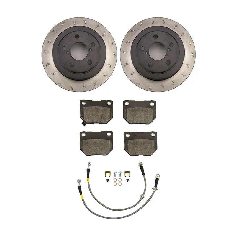 This kit includes new rotors, brake pads, and stainless steel brake lines to improve the braking performance of your vehicle.