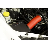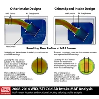 Based on our testing and research, design requirements for this intake became simple. The MAF sensor must be protected from the heat of the engine bay for more accurate readings. The filter must not be close enough to the ground such that water/hydrolocking are a concern. The MAF sensor must be placed relative to the filter and air straightener, similar to the OEM airbox, so that airflow readings are consistent and reliable. The intake tube must be no longer than necessary with minimum bend angle, to reduce restriction. The heatshield must provide sealing between the induction area and the hot engine bay to keep air intake temperatures low. The GrimmSpeed intake shown here achieves each of these requirements and more. What is accomplished is a true hybrid of traditional Cold Air Intakes and Short Ram Intakes, with all the advantages and none of the compromises.