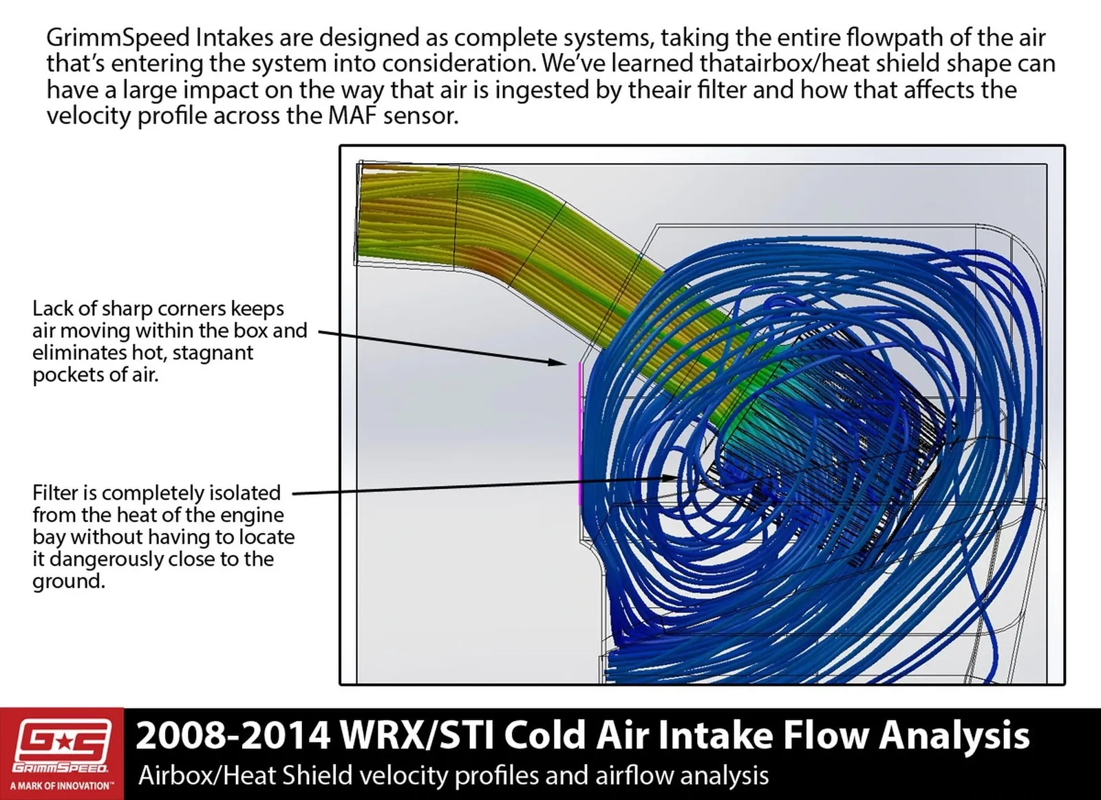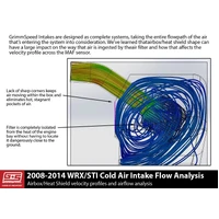 The two engineering studies above illustrate the importance of understanding how air moves within the entire intake system. The figure on the left shows how the GrimmSpeed intake design compares to other intake designs with respect to MAF placement and how that affects airflow readings. Since the MAF sensor samples the velocity of incoming air to measure flow in the center of the tube, having an accurate velocity profile at the sensor is the only way to accurately measure airflow. The figure on the right shows the importance of considering how air moves within the heat shield or box, prior to entering the filter. The GrimmSpeed heat shield geometry keeps air from collecting in sharp corners and 'feeds' the air filter uniformly. This uniform air distribution contributes to more accurate MAF readings, but also reduces filter restriction and increases time between filter cleanings due to even "filter loading." And while the airbox is doing it's job of increasing performance, it's also cleaning up the engine bay and looking good.