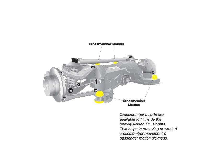 The Whiteline kit replaces the bushings in the rear subframe to dramatically reduce rear cross member misalignment and movement which allows a more positive feel from the rear end during cornering. Recommended for motorsport applications.