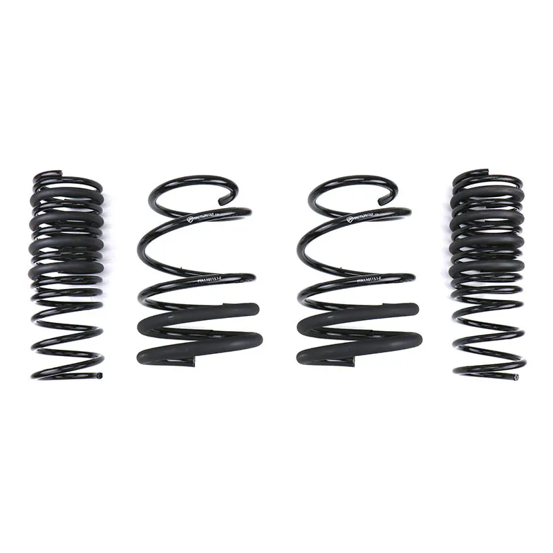 These springs are precisely engineered to optimize the handling performance of your car by taking advantage of factory strut valving and travel through increased spring rate and mild drop. They feature a moderate drop, front and rear, to eliminate the factory uneven ride height while not over-lowering the car and effecting the factory suspension geometry and vehicles dynamic characteristics. The linear spring rate offers a predictable and controllable ride while offering a modest increase in spring rate to reduce body roll and provide better handling characteristics.