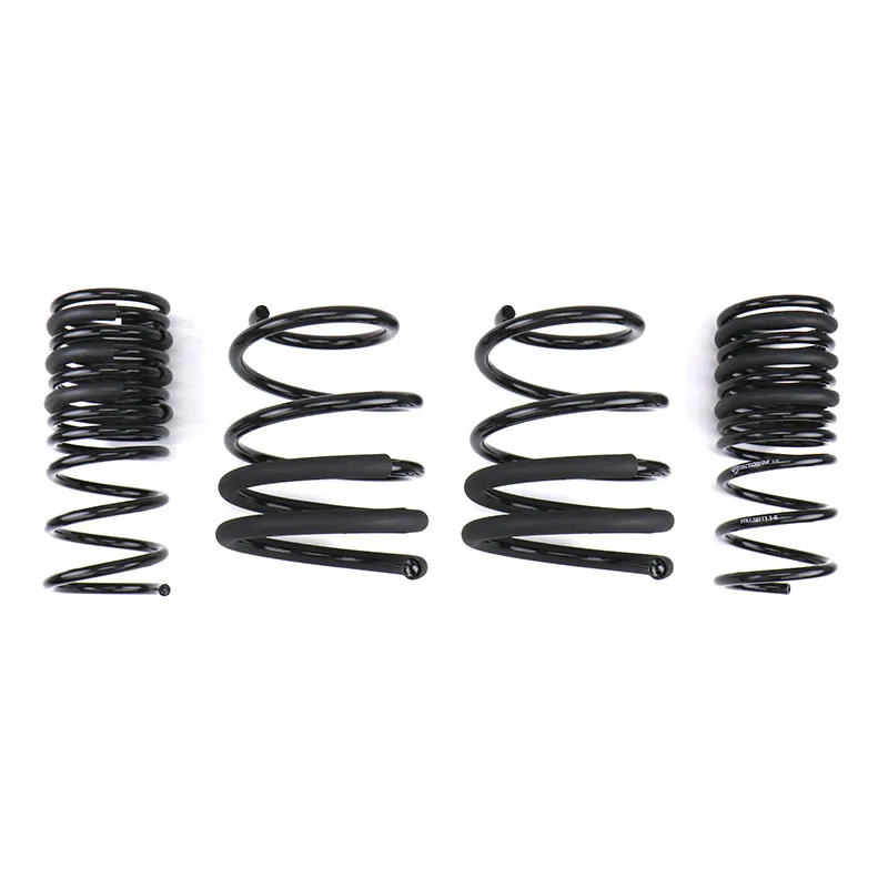 These springs are precisely engineered to optimize the handling performance of your car by taking advantage of factory strut valving and travel through increased spring rate and mild drop. They feature a moderate drop, front and rear, to eliminate the factory uneven ride height while not over-lowering the car and effecting the factory suspension geometry and vehicles dynamic characteristics. The linear spring rate offers a predictable and controllable ride while offering a modest increase in spring rate to reduce body roll and provide better handling characteristics.