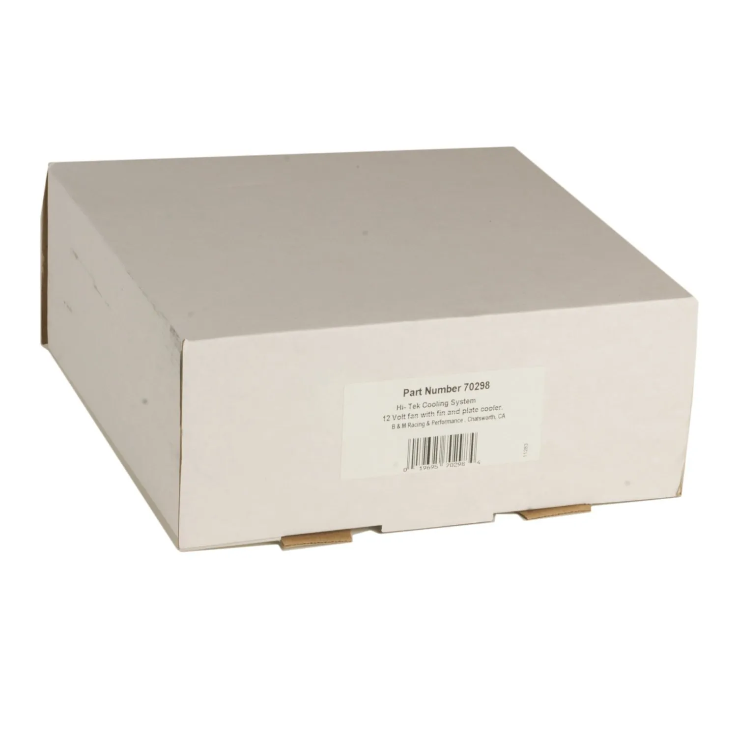 This B&M Hi-Tek SuperCooler features a fin and plate design, is fitted with a high quality 12-volt electric fan for maximum cooling efficiency and can be mounted in tight spaces. The cooler features built-in attachment points, making mounting the fan a breeze and the cooler is suitable for many fluids including transmission fluids, engine oils, differential oil, and power steering fluid. The 12-volt high capacity 6-amp suction fan cranks out 350cfm and includes a replaceable thermal fan switch set to turn the fan once the temp hits 175 degrees. SuperCoolers are pressure tested to 200 PSI. 1/2-inch NPT inlet and outlet. 10-inches x 7.5-inches x 4-inches with a 7-inch diameter fan.