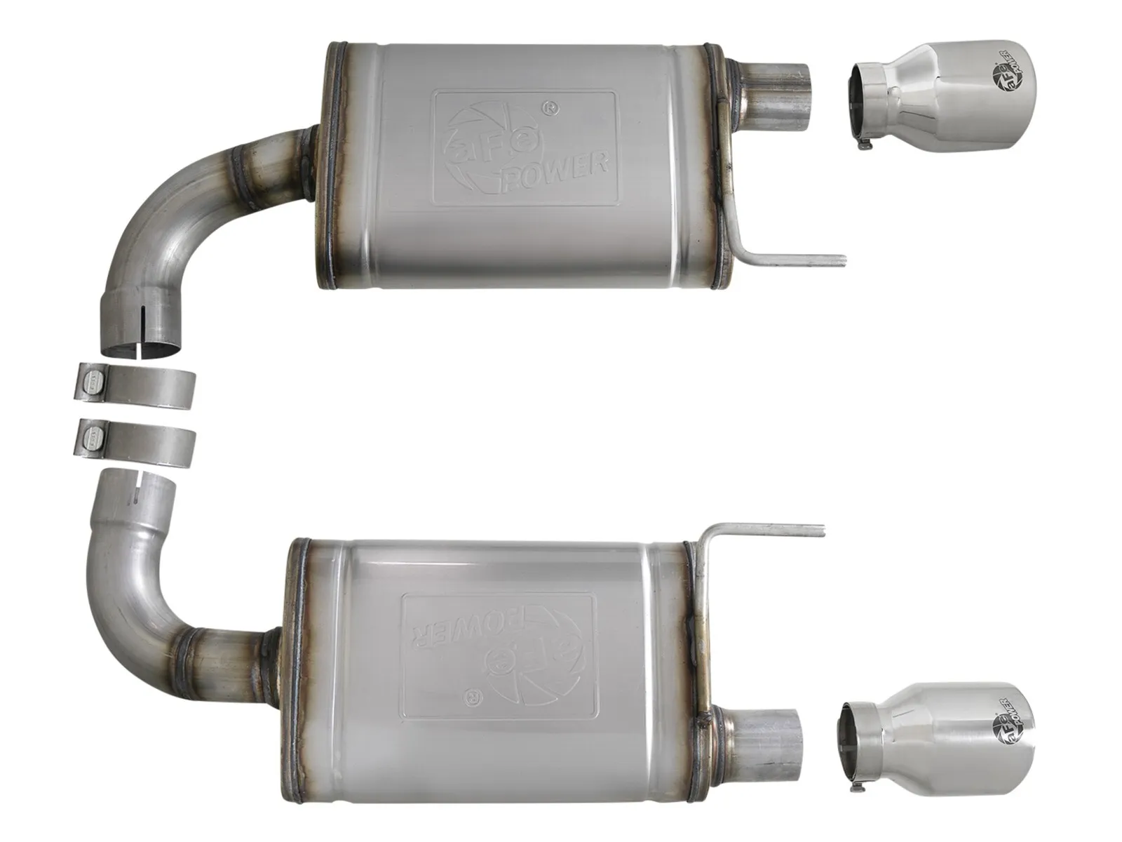 Add sound and style to your Mustang GT with this MACH Force-Xp axle-back exhaust system. Mandrel bent 409 stainless steel tubing and dual high-flow mufflers improve exhaust flow to deliver an aggressive sound. Dual 4" carbon fiber tips with the aFe POWER logo adds a custom look to your S550. This system requires cutting and removing the factory muffler assemblies.