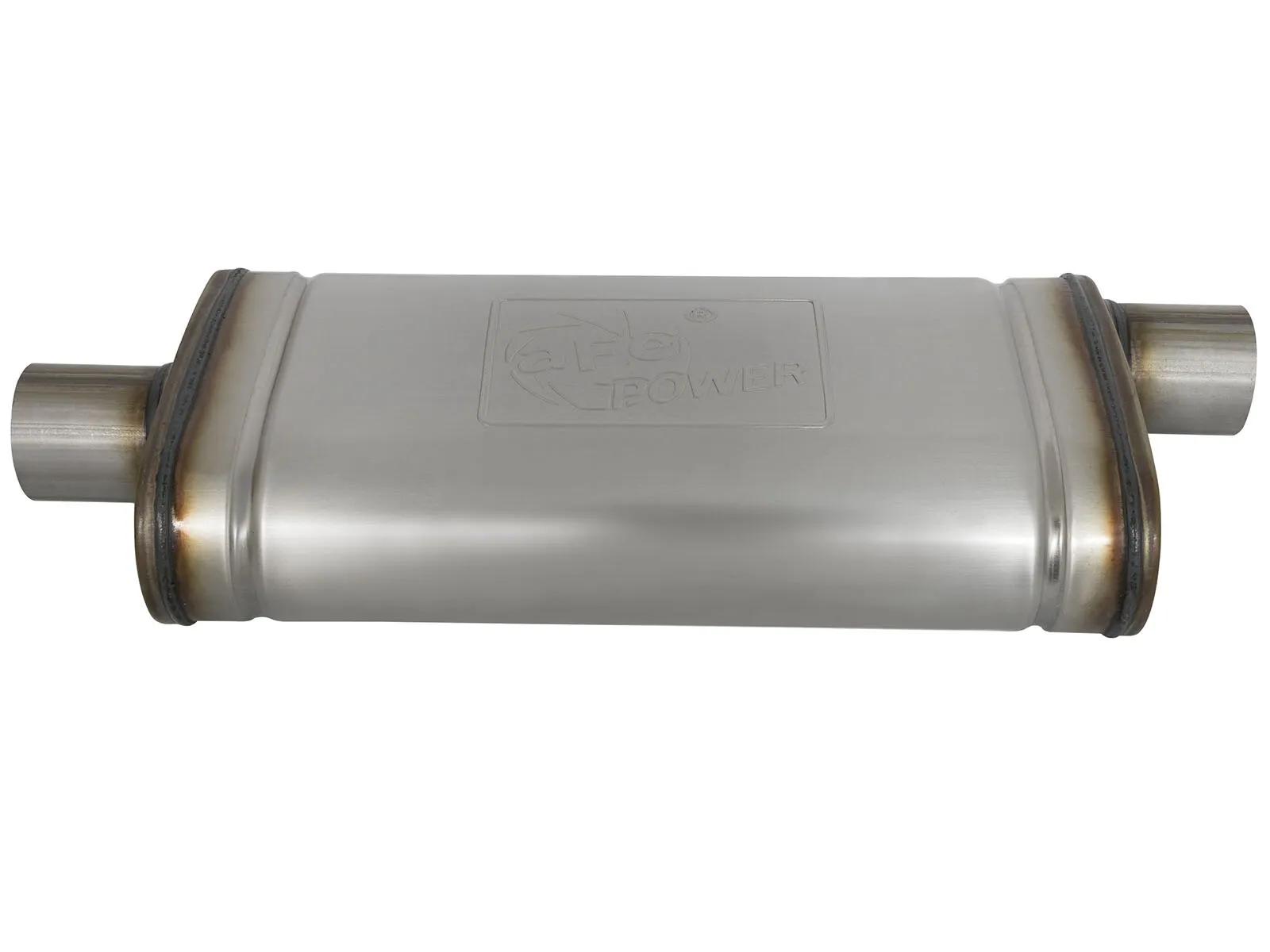 The aFe Universal fit 409 Stainless Steel Performance Muffler is designed to provide a deep, throaty, powerful sound on acceleration but maintain a smooth sound at idle. This muffler is constructed of brushed finished 409 stainless steel and uses a straight through perforated core with heat resistant packing to reduce backpressure and maximize exhaust flow. You will see increased performance and improved throttle response over the factory exhaust. Also featuring a stamped aFe POWER logo for an aggressive style.