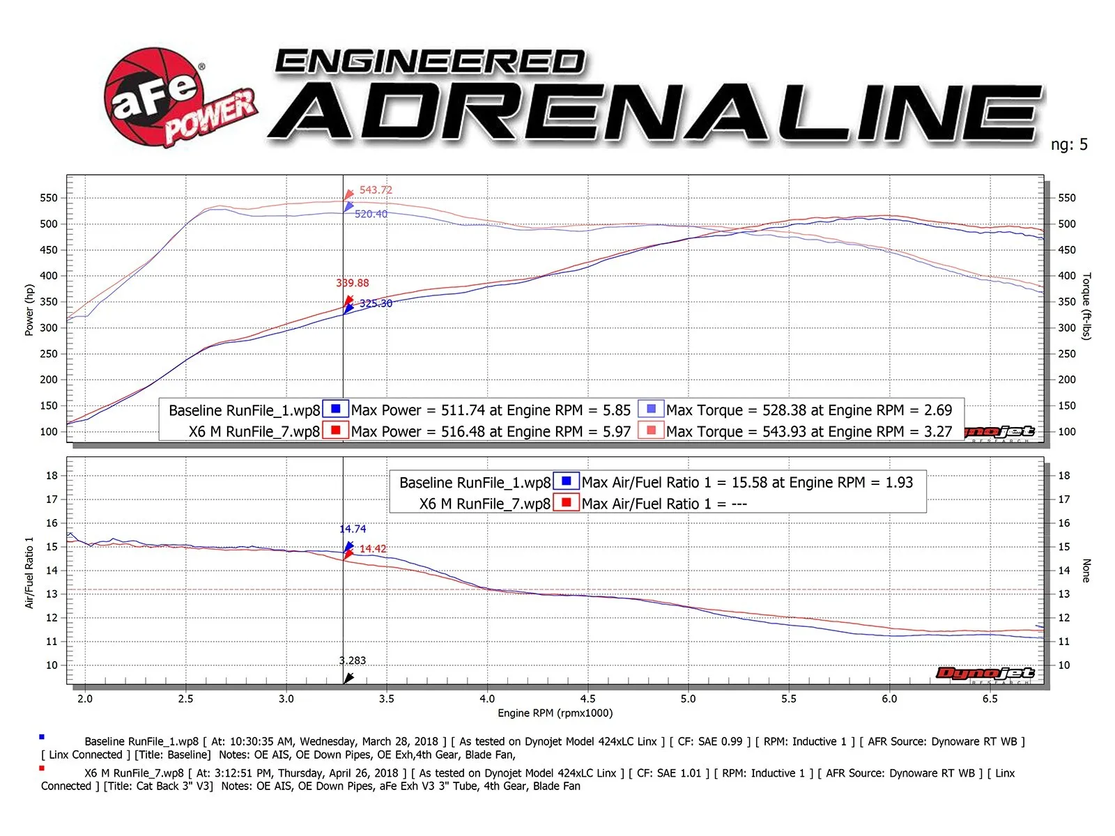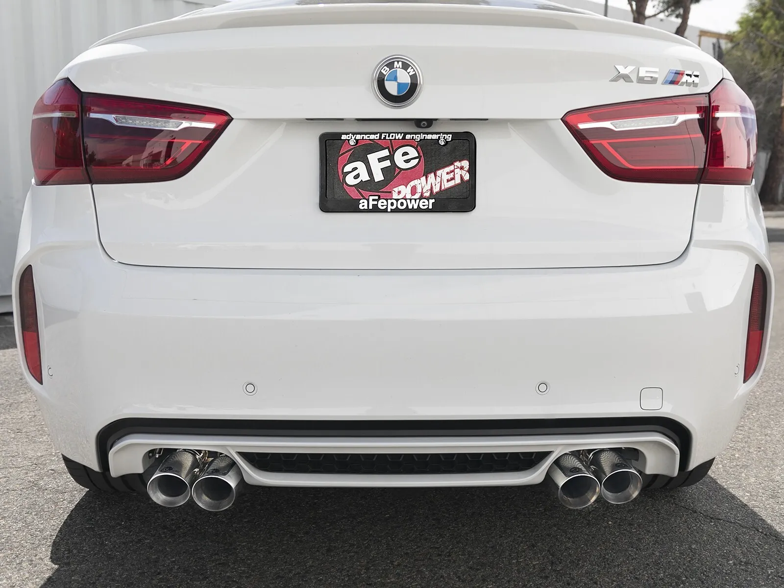 Add power, sound and unique style to your BMW X5/X6 M with this aFe POWER cat-back system which produced gains of up to +15 horsepower and +23 lbs. x ft. torque as measured on our in-house dyno. Dual 3" to 2-1/2" mandrel-bent, TIG welded, brush finished 304 stainless steel tubing keeps exhaust flowing smoothly for power gains you can feel. The factory exhaust valve motor is used to regulate the exhaust flow from a closed-valve, aggressive tone to wide-open, competition sound. True quad, 3 1/2" polished stainless steel exhaust tips with laser etched aFe POWER logo for a custom finish.