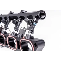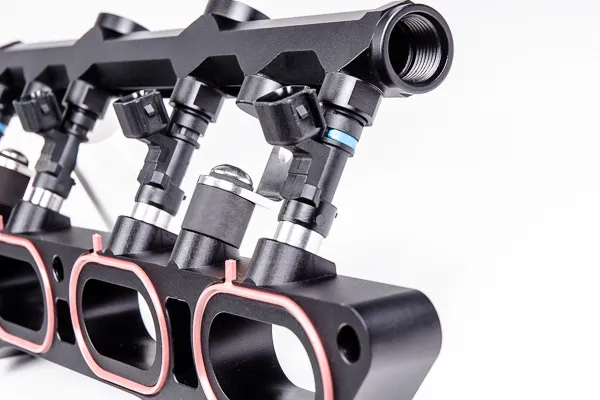 The fuel rail features a large 0.63" internal diameter bore. It is CNC machined from extruded 6063 aluminum and laser etched for a high quality surface finish. All 4 ports are machined with an 8AN ORB (3/4-16 female) threads. Note that the 2 top fuel rail ports will need to be plugged with 14-0150 unless the plastic OEM wiring harness carrier is modified (see in pictures).