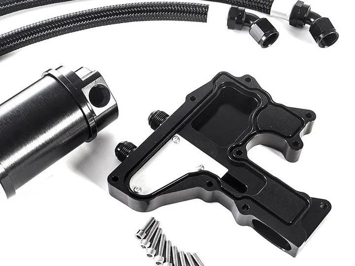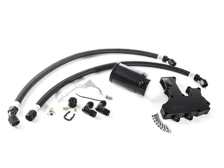 Our kit includes the necessary valve cover breather adapter to remove the separator and plumb the catch can using the two included -10AN hoses. Using our catch can kit, you are not required to remove any of the emissions system or vent the catch can to the atmosphere, which can cause oil mist build-up in your engine bay. Our breather plate simply installs in place of the factory plastic breather plate located on top of the valve cover, while the catch can mounts to a custom bracket easily accessible on the passenger side of the vehicle.