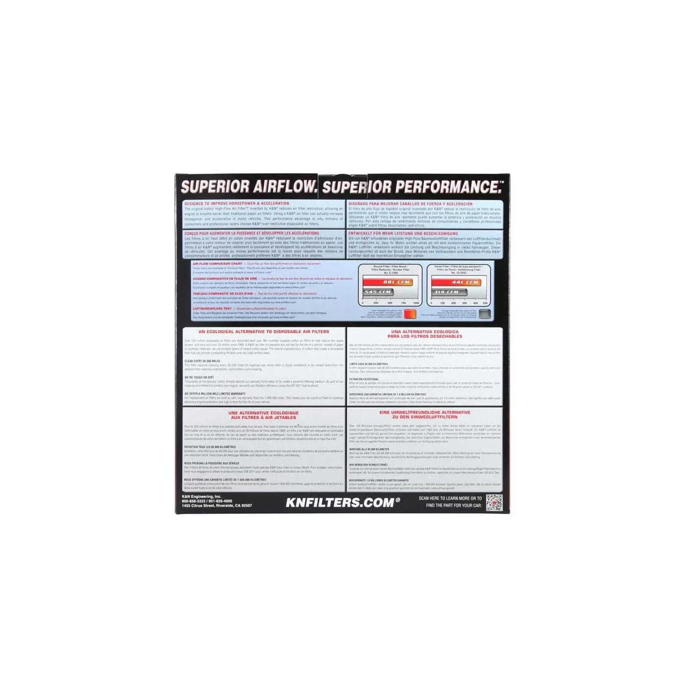 K&N® washable, reusable High-Flow Air Filters™ feature a state-of-the-art design of layered, oiled cotton media engineered to improve airflow and capture contaminants, and are designed to provide an increase in horsepower. Each performance air filter is reusable, engineered to last for the entire lifespan of your vehicle, and backed by K&N’s 10-Year/Million Mile Limited Warranty. K&N drop-in replacement filters are designed to install easily into your factory air box. Upgrade today and start enjoying superior airflow and superior performance from K&N’s most popular product!