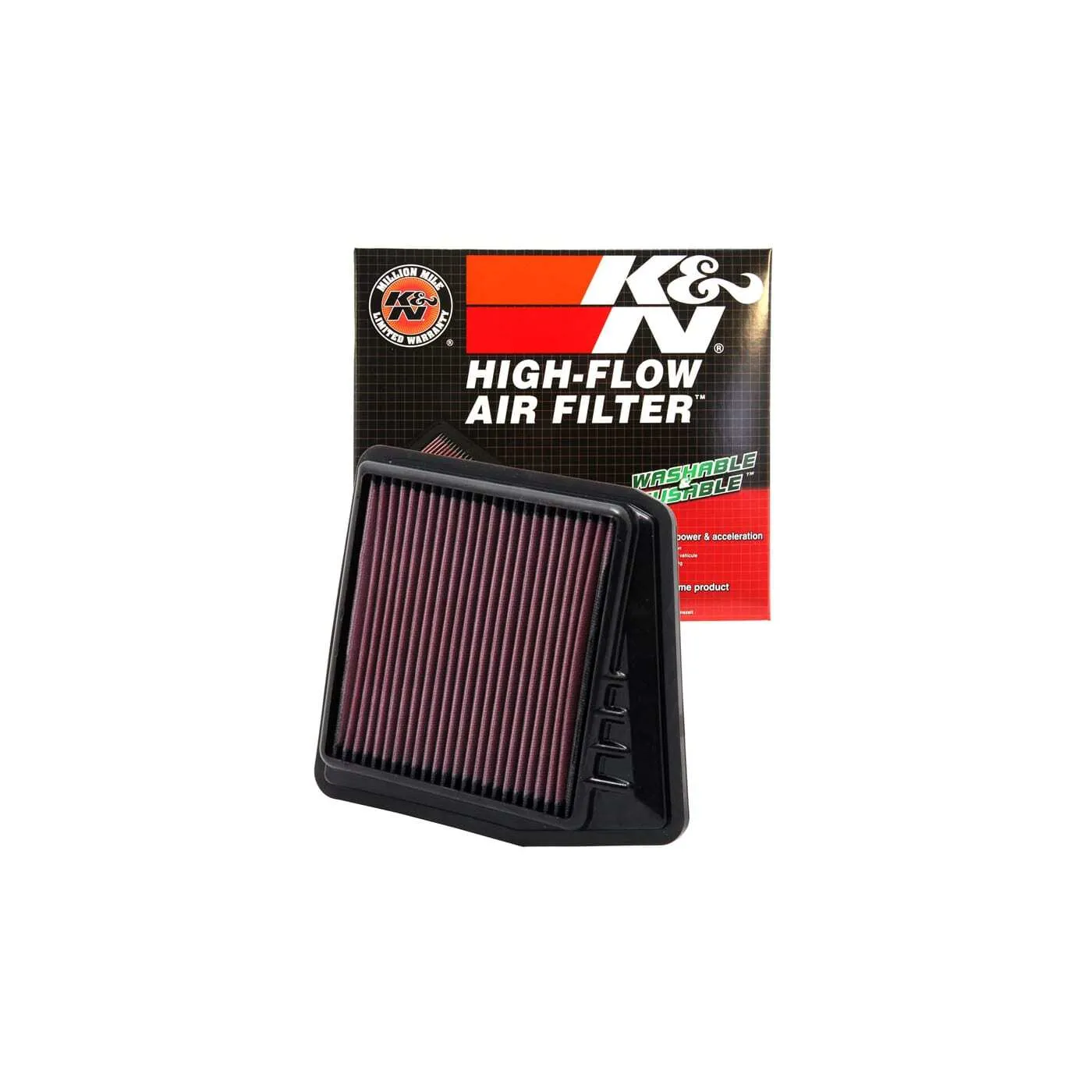 K&N® washable, reusable High-Flow Air Filters™ feature a state-of-the-art design of layered, oiled cotton media engineered to improve airflow and capture contaminants, and are designed to provide an increase in horsepower. Each performance air filter is reusable, engineered to last for the entire lifespan of your vehicle, and backed by K&N’s 10-Year/Million Mile Limited Warranty. K&N drop-in replacement filters are designed to install easily into your factory air box. Upgrade today and start enjoying superior airflow and superior performance from K&N’s most popular product!