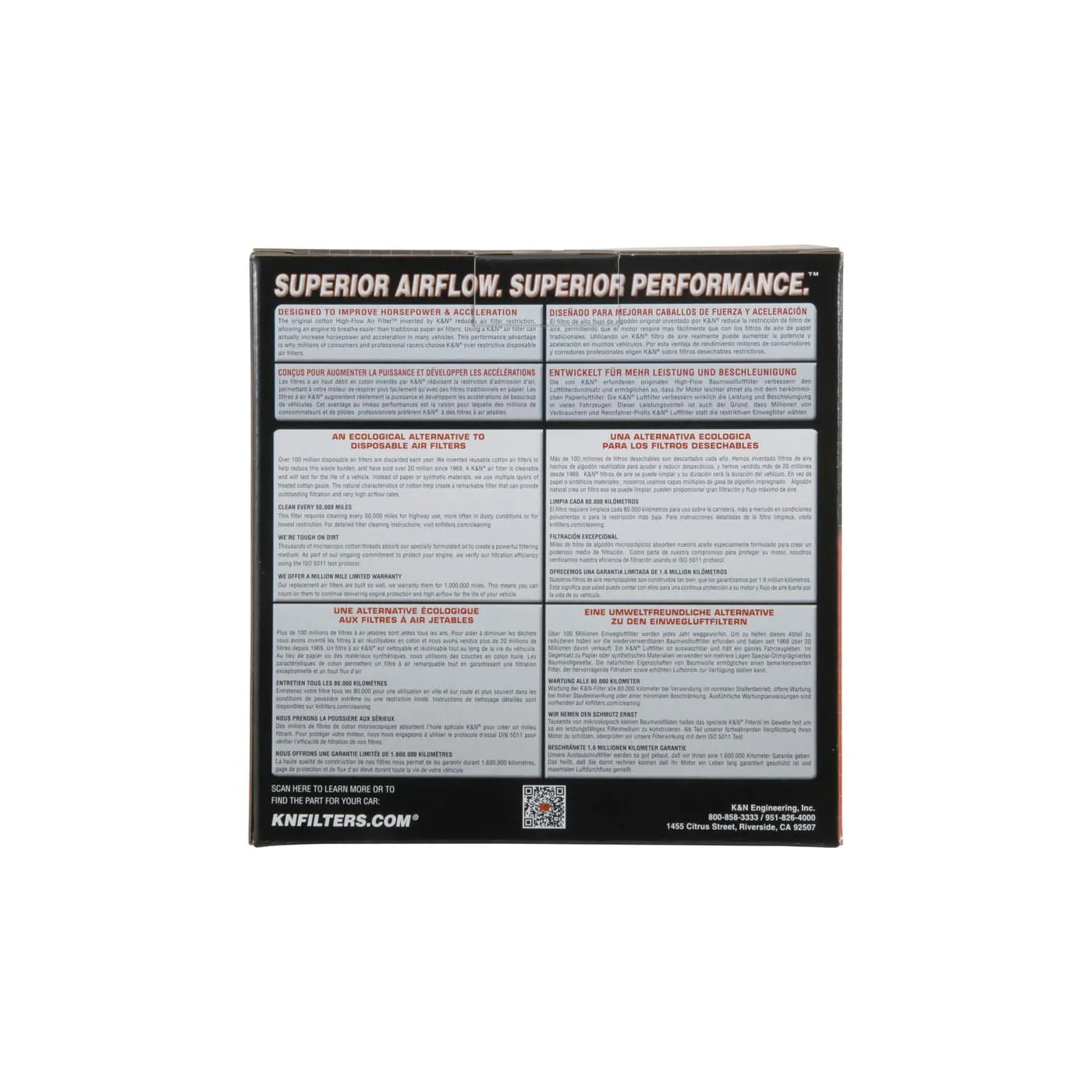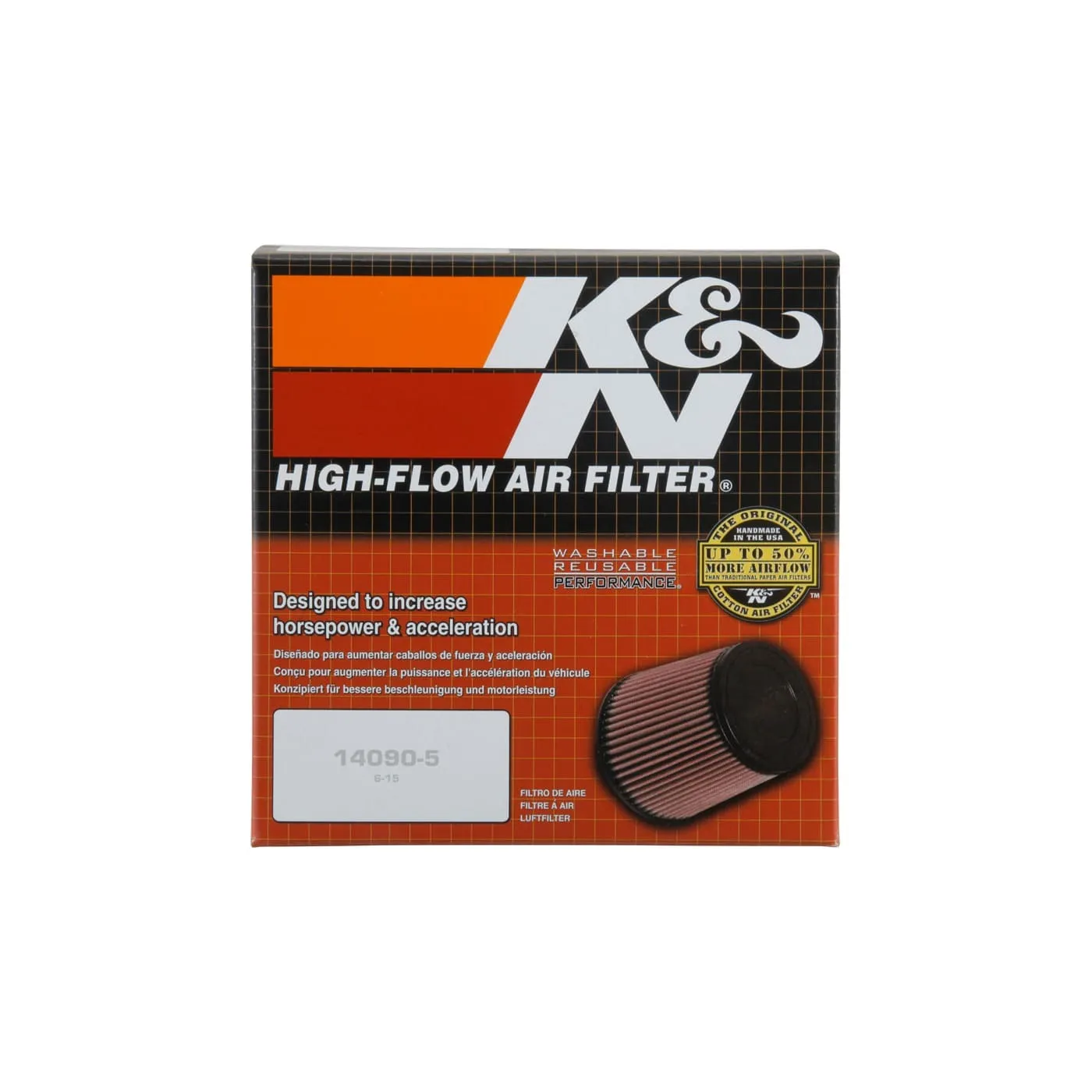 K&N® washable, reusable High-Flow Air Filters™ feature a state-of-the-art design of layered, oiled cotton media engineered to improve airflow and capture contaminants, and are designed to provide an increase in horsepower. Each performance air filter is reusable, engineered to last for the entire lifespan of your vehicle, and backed by K&N’s 10-Year/Million Mile Limited Warranty. K&N drop-in replacement filters are designed to install easily into your factory air box. Upgrade today and start enjoying superior airflow and superior performance from K&N’s most popular product!