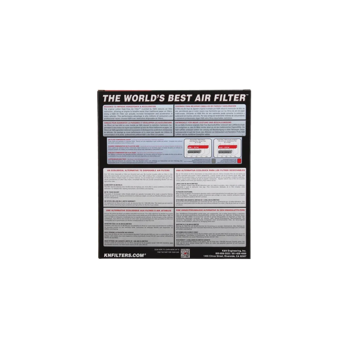 K&N® washable, reusable High-Flow Air Filters™ feature a state-of-the-art design of layered, oiled cotton media engineered to improve airflow and capture contaminants, and are designed to provide an increase in horsepower. Each performance air filter is reusable, engineered to last for the entire lifespan of your vehicle, and backed by K&N’s 10-Year/Million Mile Limited Warranty. K&N drop-in replacement filters are designed to install easily into your factory air box. Upgrade today and start enjoying superior airflow and superior performance from K&N’s most popular product!