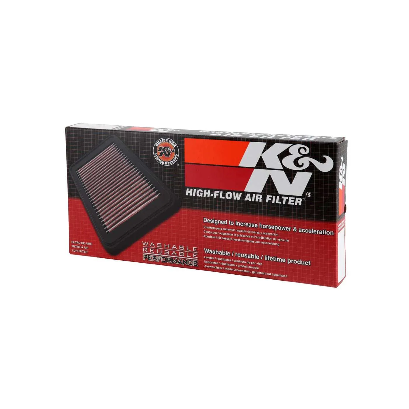 K&N® washable, reusable High-Flow Air Filters™ feature a state-of-the-art design of layered, oiled cotton media engineered to improve airflow and capture contaminants, and are designed to provide an increase in horsepower. Each performance air filter is reusable, engineered to last for the entire lifespan of your vehicle, and backed by K&N’s 10-Year/Million Mile Limited Warranty. K&N drop-in replacement filters are designed to install easily into your factory air box. Upgrade today and start enjoying superior airflow and superior performance from K&N’s most popular product!