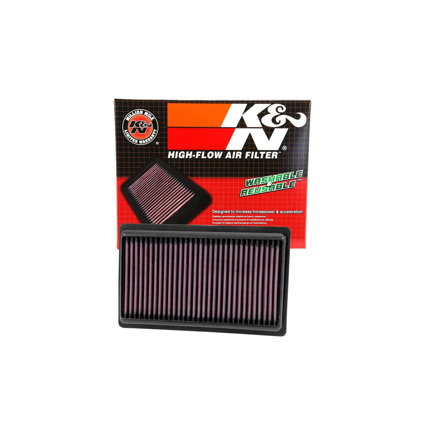 K&N® washable, reusable High-Flow Air Filters™ feature a state-of-the-art design of layered, oiled cotton media engineered to improve airflow and capture contaminants, and are designed to provide an increase in horsepower. Each performance air filter is reusable, engineered to last for the entire lifespan of your vehicle, and backed by K&N’s 10-Year/Million Mile Limited Warranty. K&N drop-in replacement filters are designed to install easily into your factory air box. Upgrade today and start enjoying superior airflow and superior performance from K&N’s most popular product!