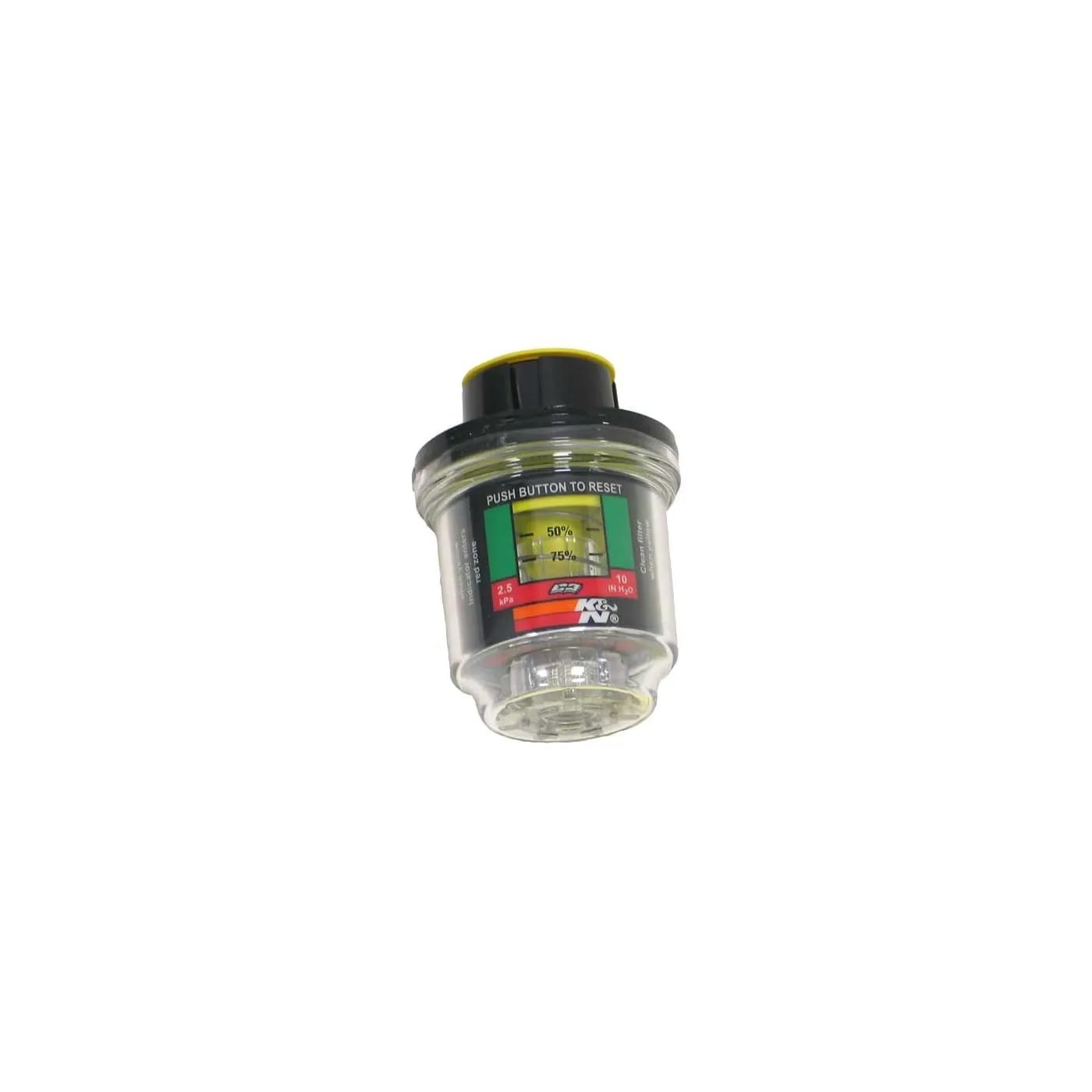 A Filter Minder® works as air filter service indicator that monitor air filter restriction and indicates when the air filter should be serviced. As the air filter gets dirty, the yellow position indicator moves in the clear window of the service indicator and locks at the highest point. It can be read even after the engine is turned off. The air filter should not be cleaned until the yellow position indicator reaches the red zone.