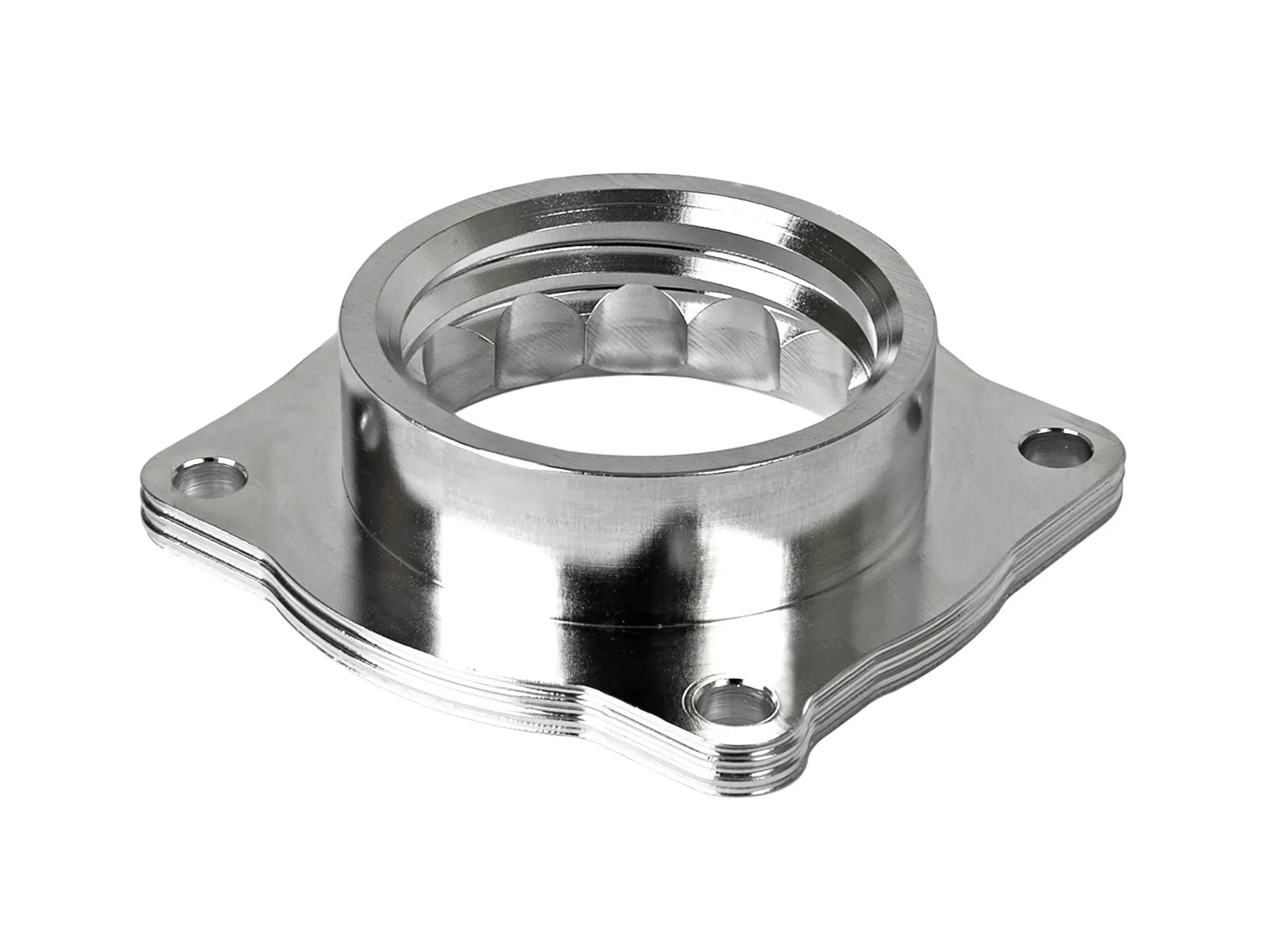 Serrated/Helix Design: The Serrated/Helix combination design creates intake turbulence in the combustion chamber. This turbulence breaks up the fuel which creates a more complete combustion cycle increasing horsepower, torque and improving throttle response. The Serrated/Helix combination design also reduces intake whistle that occurs with helix-only designs. 6061-T6 Billet Aluminum Construction: All Silver Bullet Throttle Body Spacers are constructed from 6061-T6 billet aluminum precision machined for light weight, high strength and perfect fit and finish. Longer Intake Track: Adding a Silver Bullet Throttle Body spacer lengthens the intake track which helps increase intake air speed, performance and improve throttle response.In recent dyno testing, this throttle body spacer produces up to 10hp and 14lbs. x ft. torque on the popular E46.
