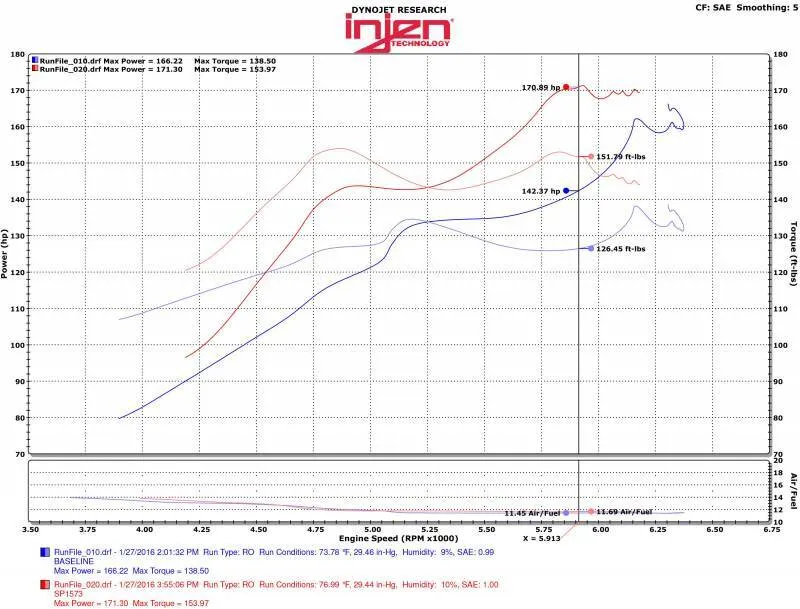 The soul of this intake is found within 6061-T6 aluminum air intake tube that provides a smooth uninterrupted path for highly efficient airflow. Our engineers have painstakingly designed the intake to provide the highest levels of safe power, along with clean aesthetics that will impress every time you open your hood. In addition to the impressive power increase, the Injen team has ensured that a safe Air fuel (A/F) ratio has been maintained throughout the power band.