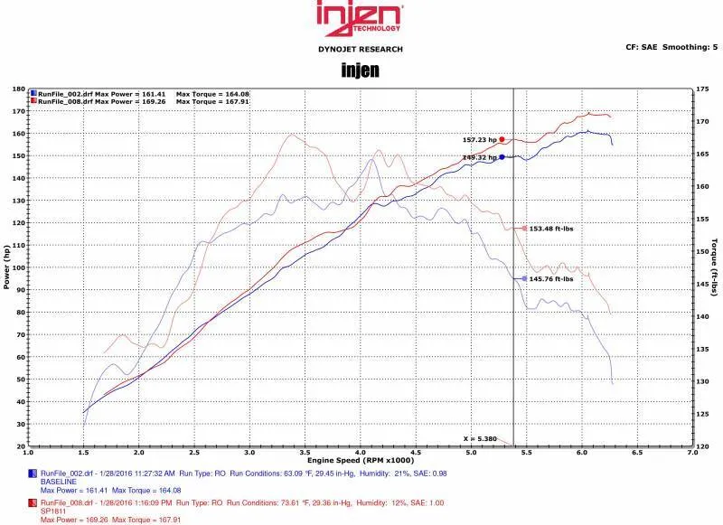The soul of this intake is found within 6061-T6 aluminum air intake tube that provides a smooth uninterrupted path for highly efficient airflow. Our engineers have painstakingly designed the intake to provide the highest levels of safe power, along with clean aesthetics that will impress every time you open your hood. In addition to the impressive power increase, the Injen team has ensured that a safe Air fuel (A/F) ratio has been maintained throughout the power band.