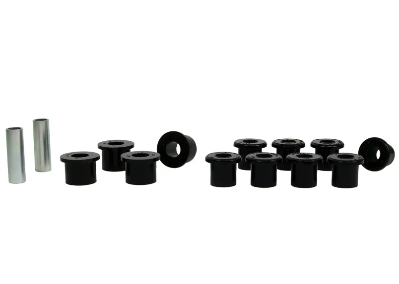 All in one leaf spring bushing service kit covering front and rear eyes of the leaf plus shackle bushings. High kilometres and heavy load carrying causes excessive wear on rubber bushings. Whiteline's signature black bushings are made tough and offer outstanding abrasion resistance, high load bearing capability (4WD's, utes and towing), flexibility, increased tensile strength and chemical resistance to oil, grease, ozone and weathering.