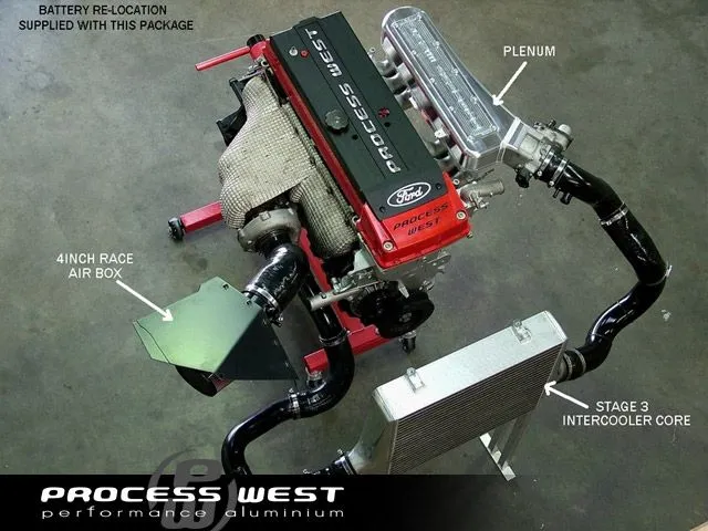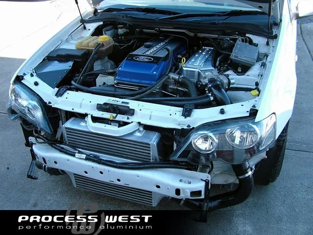 The Process West Stage 3 Front Mount Intercooler Core for the Ford BA/BF Falcon includes a 500 x 425 x 100mm bar & plate core, which is the largest and most efficient intercooler for the BA/BF Falcon on the market today. This allows for smooth flow and effective cooling of the charge air entering the engine. Includes hot and cold-side intercooler piping with lightweight mandrel bent aluminium piping.