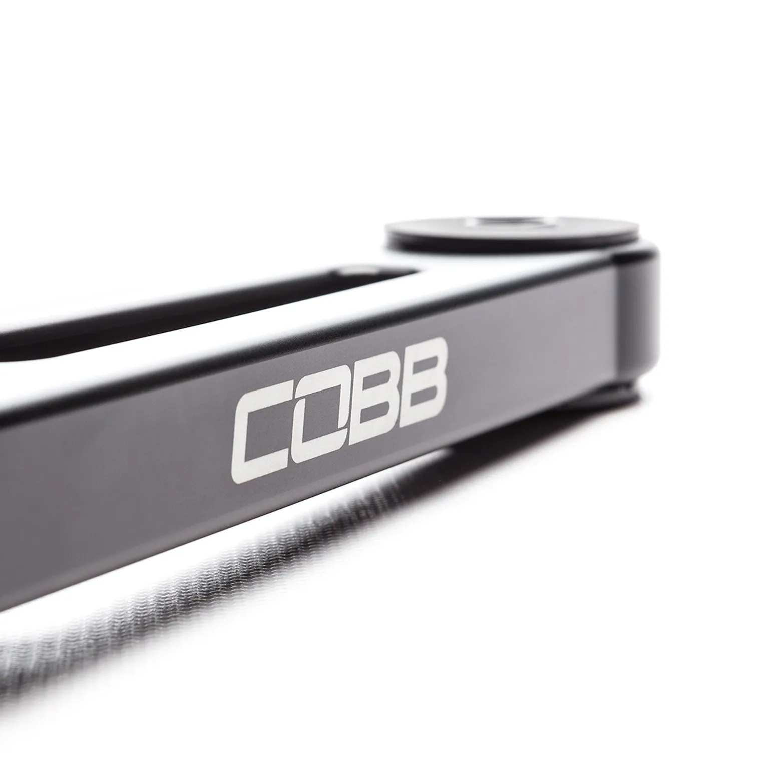 The COBB Subaru Pitch Stop Mount is constructed of CNC machined 6061-T6 aluminum and finished with black anodizing. The COBB logo is laser engraved on the top and bottom of the mount. A 68A High Rebound bushing at the firewall and 85A bushing at the motor provide a more solid mount than stock without being too harsh for normal driving. Grooves in the bushing ensure grease stays where it needs to be and prevents creaking after extended use.