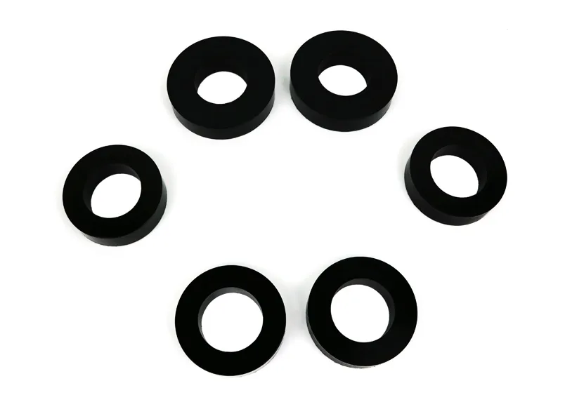 This easy to install kit is designed to change the inclination of the rear sub-frame whilst reducing bushing compliance. By locating the rings in different planes it possible to induce rear squat (maximum traction) or anti-squat (drift) properties. This product may induce increased NVH levels.